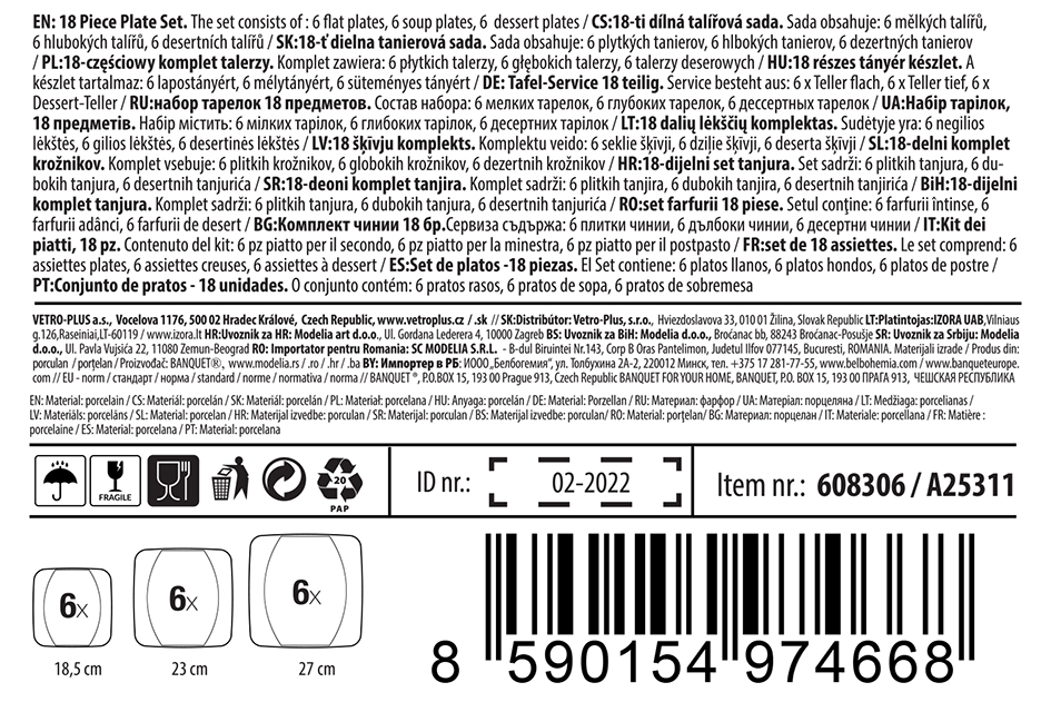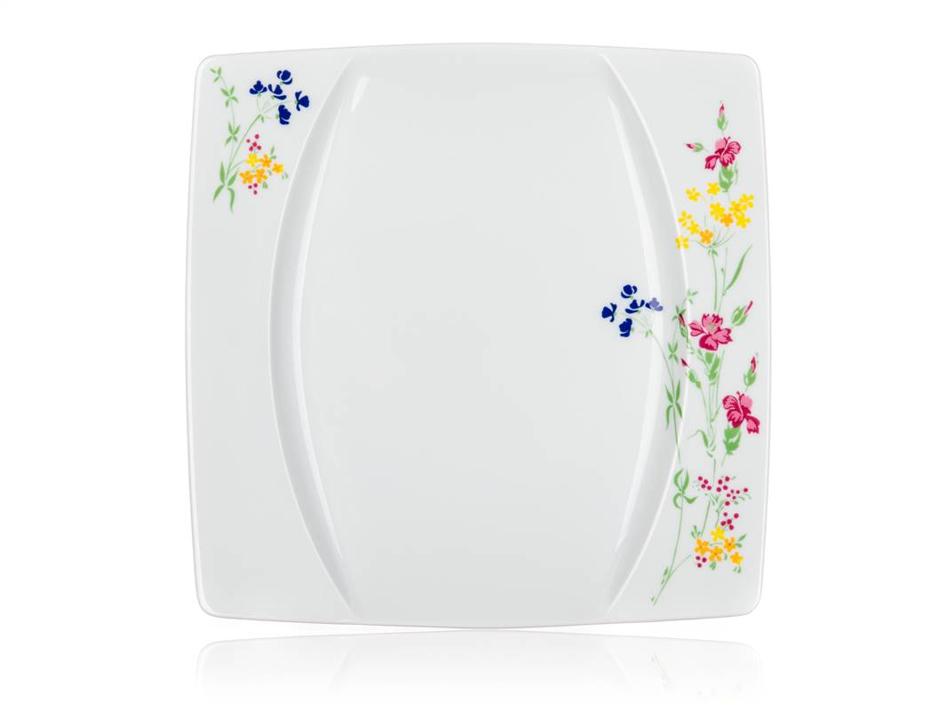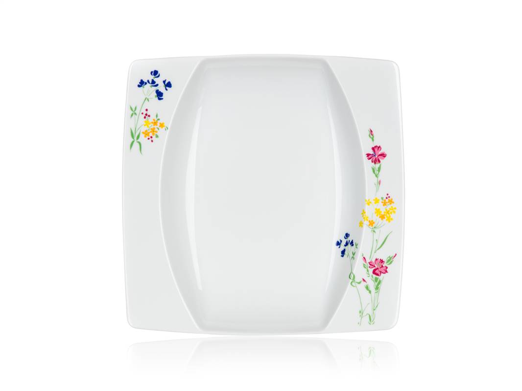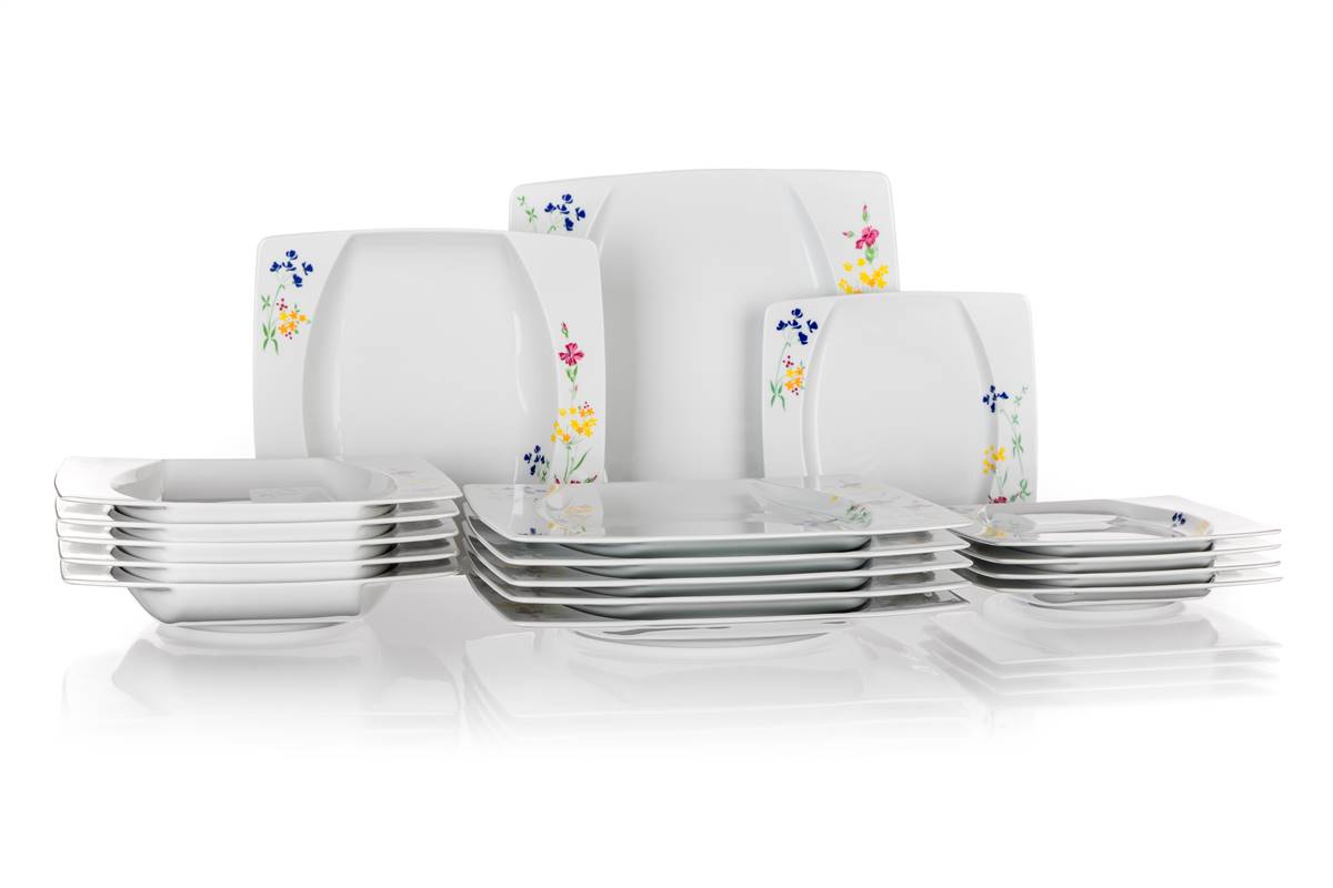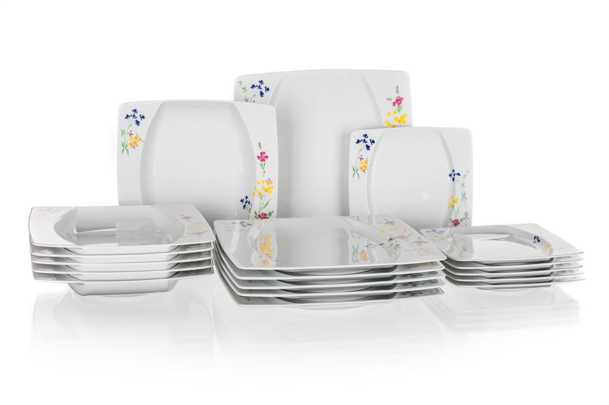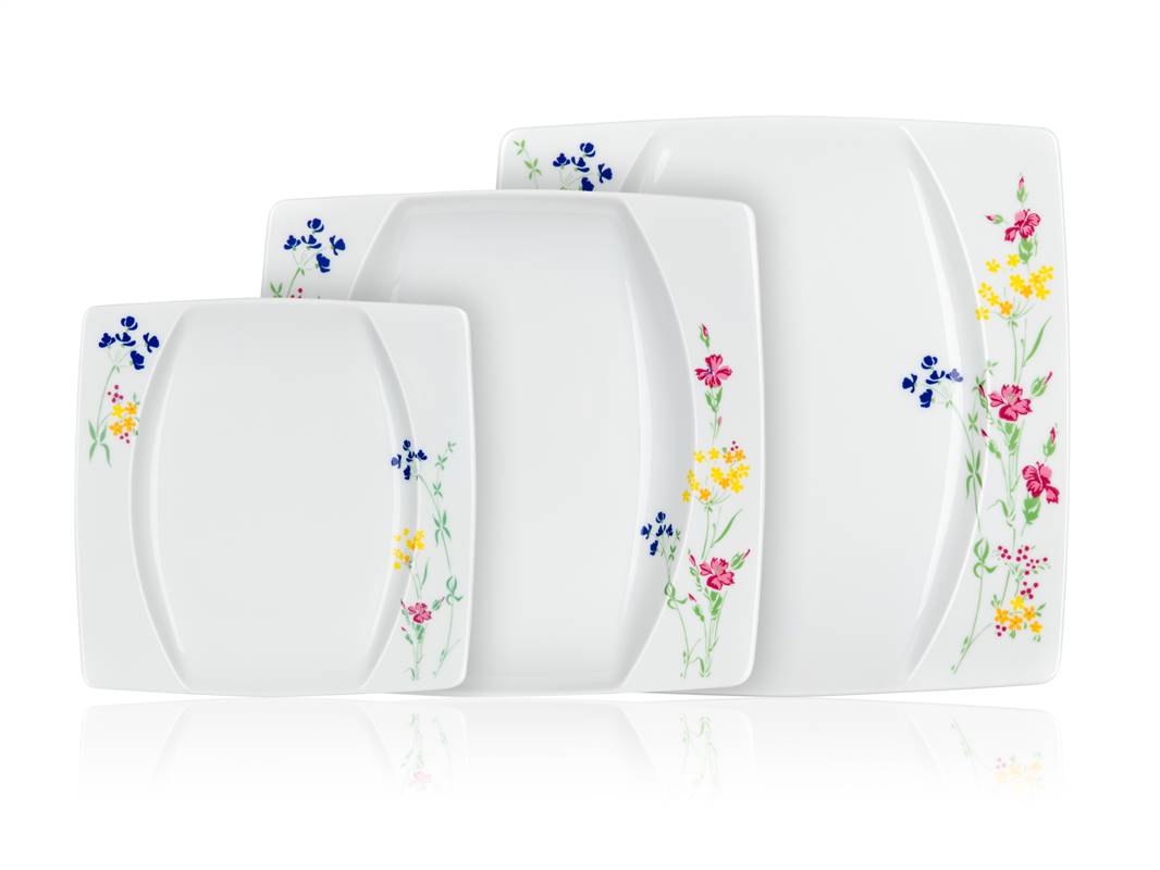 18-częściowy zestaw talerzy porcelanowych square, wykonany w czeskiej fabryce porcelany Thun. Zestaw zawiera: 6 x płytki talerz o wymiarach 27 x 27 cm, 6 x głęboki talerz o wymiarach 23 x 23 cm, 6 x talerz deserowy o wymiarach 18,5 x 18,5 cm. Talerzy można używać w kuchence mikrofalowej i myć w zmywarce do naczyń.