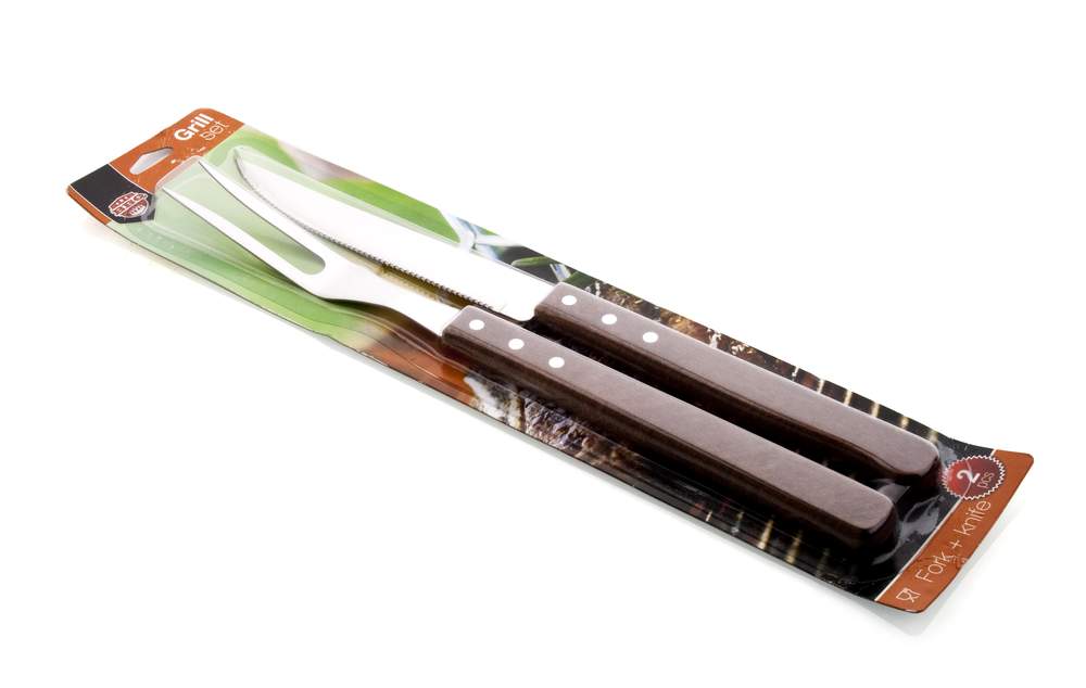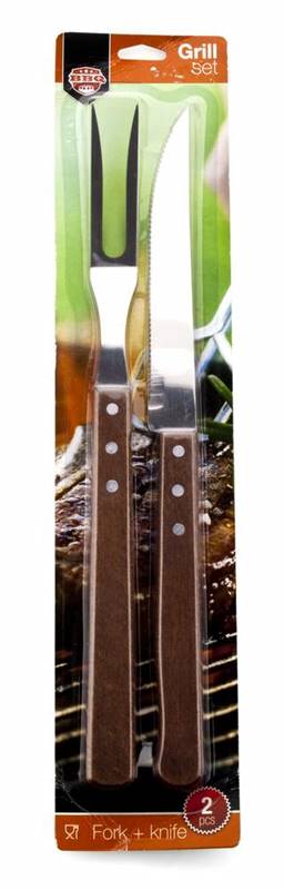 2częściowy zestaw do grillowania jest złożony z długiego noża i widelca z drewnianą rączką. Część robocza jest wyprodukowana ze stali nierdzewnej, grubość ostrza: 1,5 mm – nóż i widelec, wykończenie powierzchni ostrza: połysk, długość ogólna noża: 38 cm, długość ostrza: 19 cm. Grubość rączki 1,35 cm, szerokość rączki 2,4 cm. Długość ogólna widelca z dwoma kolcami. 38 cm, długość rączki 22 cm, grubość rączki 1,4 cm szerokość rączki 2,4 cm.