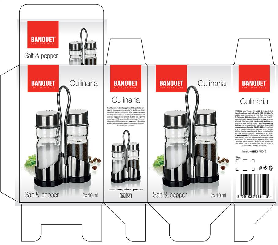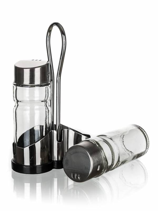 Zestaw solniczka i pieprzniczka CULINARIA II 40 ml, 3 szt. Wieczko: stal nierdzewna 18/8 i tworzywo PP oraz uszczelka silikonowa, grubość stali nierdzewnej 0,40 mm, pojemniki: szkło, stojak stal nierdzewna 18/0, podstawa: 0,40 mm, uchwyt drut 5,0 mm.