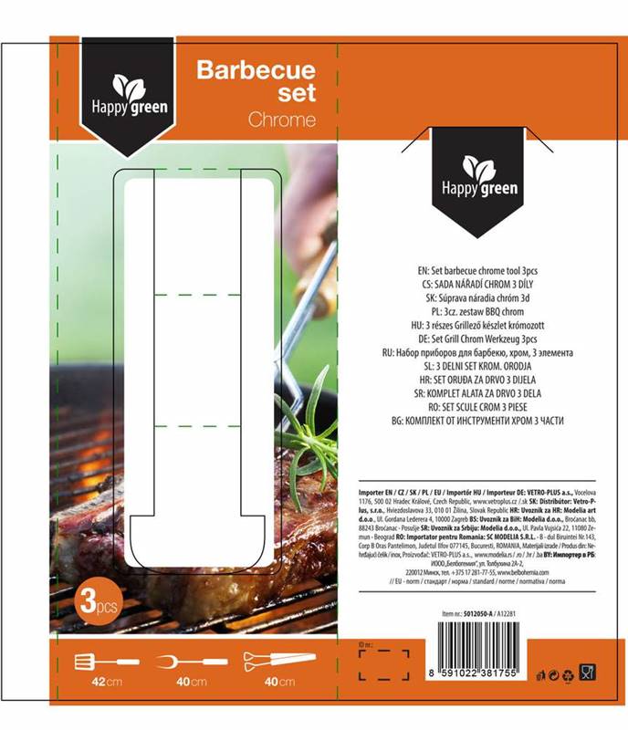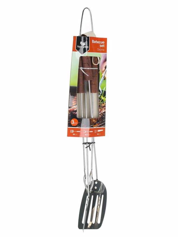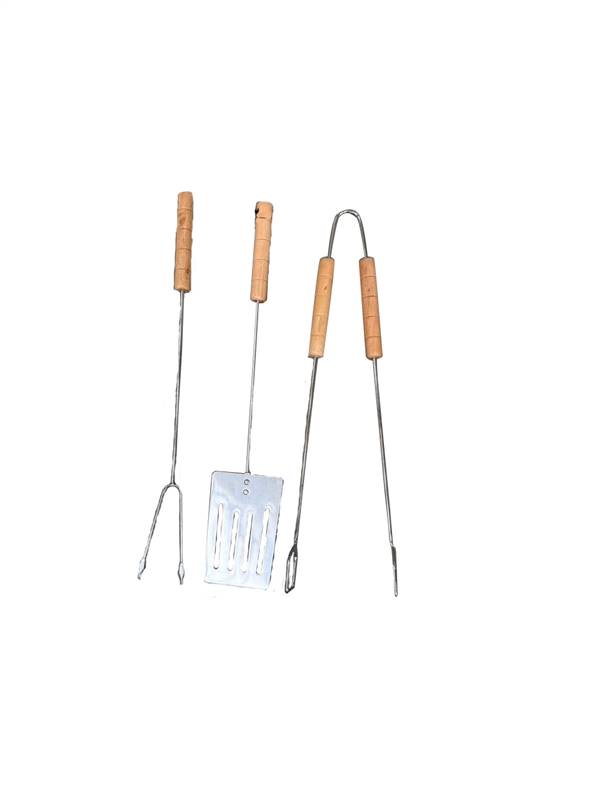 3częściowy zestaw naczyń do grilla zawiera kleszcze, łyżkę do obracania i widelec ze stali chromowanej. Rączka jest z drewna. Zestaw zawiera podstawowe narzędzia niezbędne do grilla. Narzędzie jest wyposażone w uszko do zawieszenia.