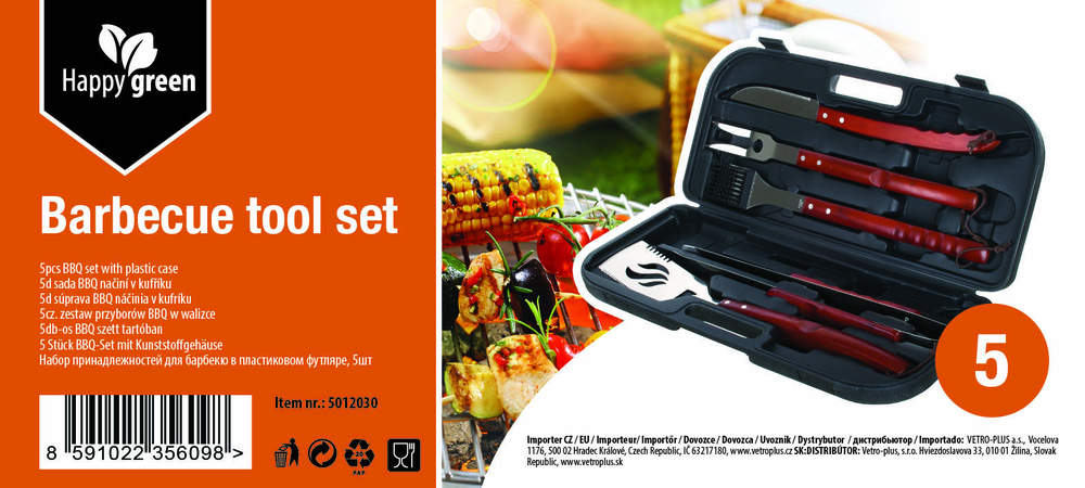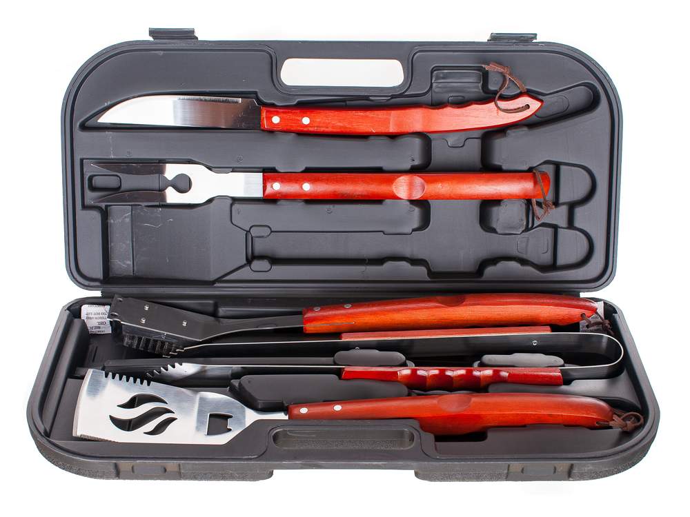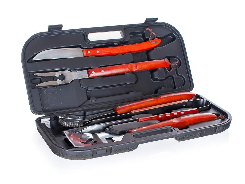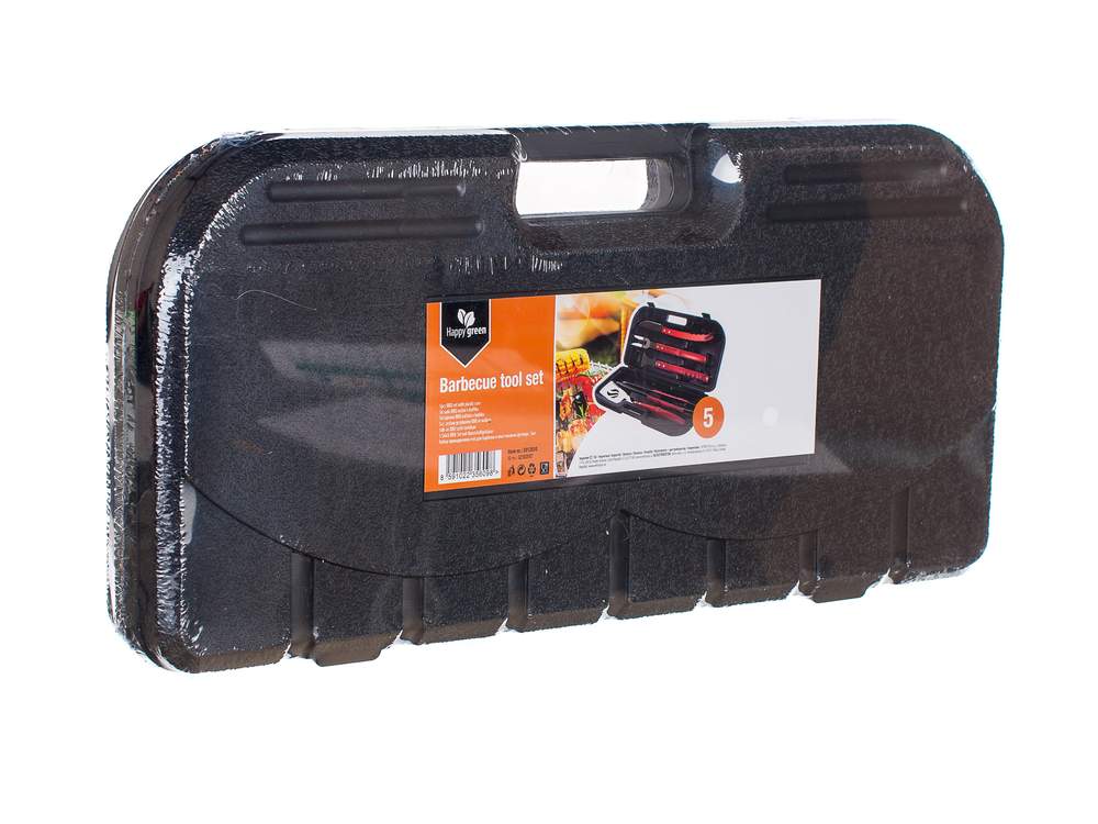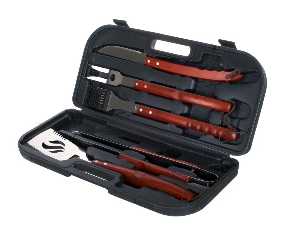 Zestaw ze stali nierdzewnej z drewniana rączką w kufrze z tworzywa zawiera: szczotkę drucianą do czyszczenia 48 cm, szczypce zębate do grilla 45 cm, łopatka do obracania 48 cm, nóż do porcjowania z ostrzem o długości 45 cm, widelec z 2 kolcami 46 cm.