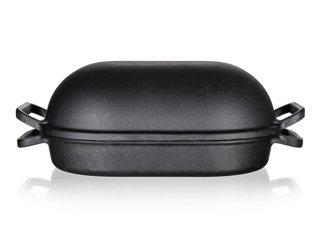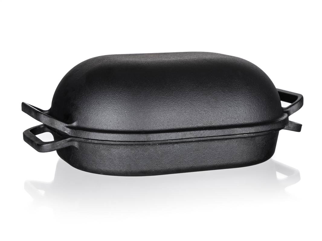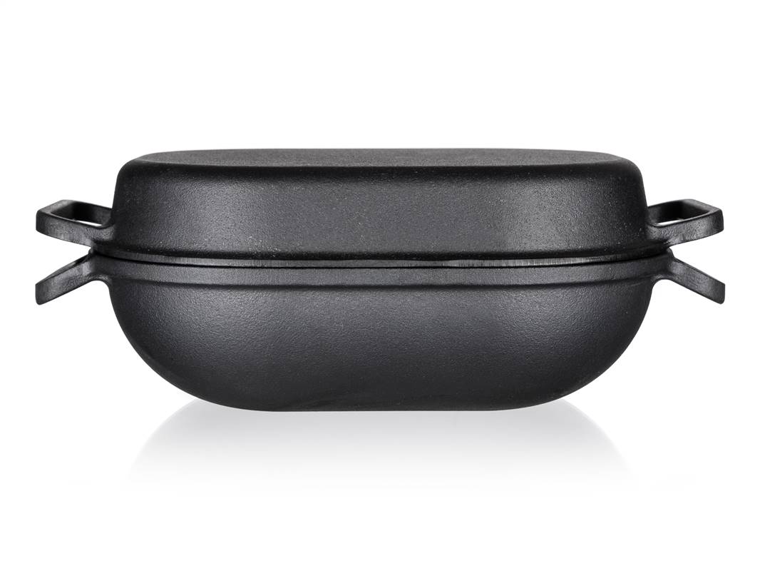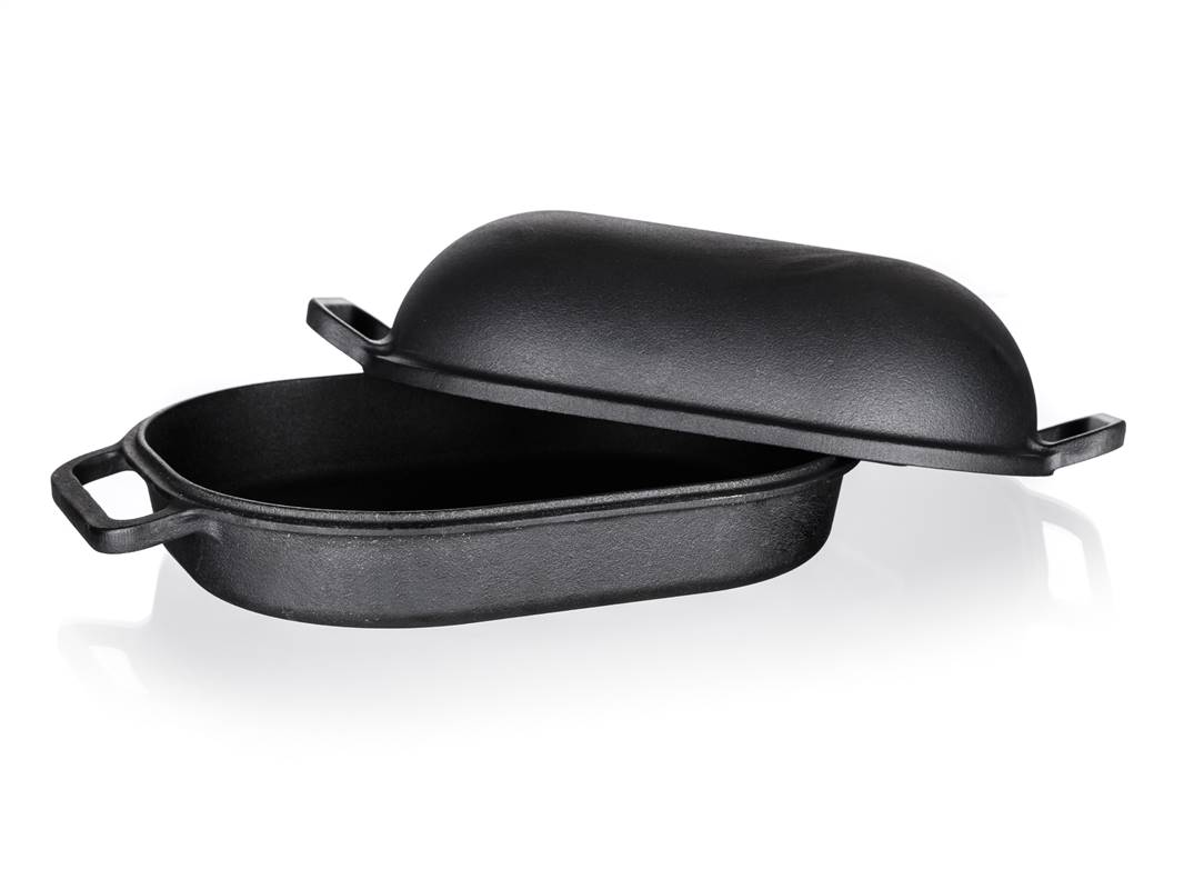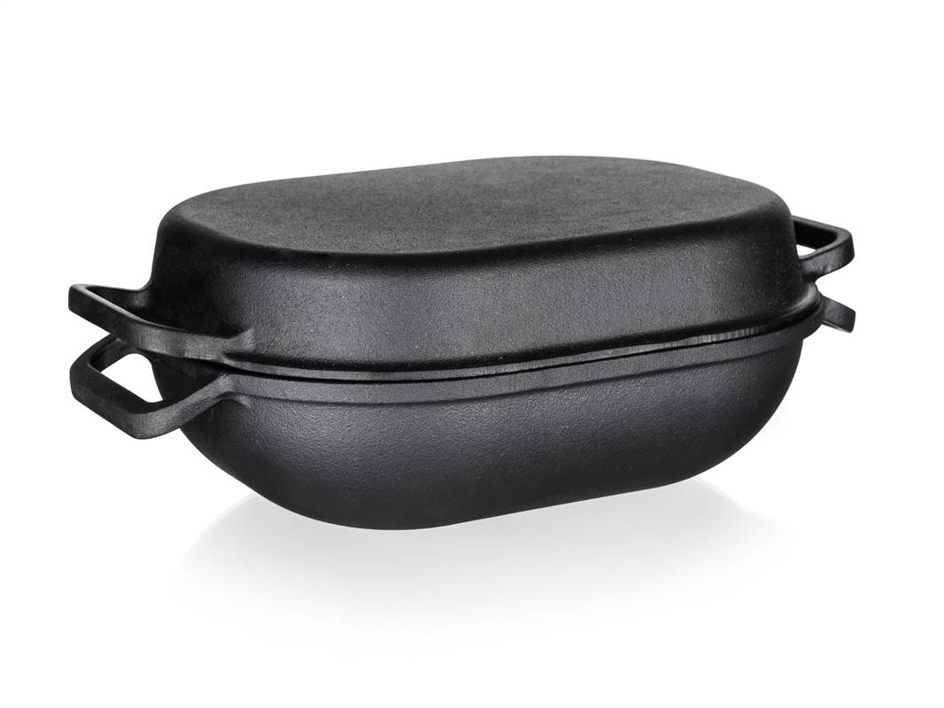Żeliwna brytfanna EXCELLENT owalna z pokrywą o pojemności 3 + 4 l i wymiarach 39 x 26 x 14 cm w kolorze czarnym. Żeliwne naczynie do pieczenia jest idealne do pieczenia i zapiekania w piekarniku, jak również do gotowania, duszenia i smażenia na kuchence. Żeliwo jest idealne do gotowania i pieczenia. Solidny materiał, który długo utrzymuje ciepło po podgrzaniu i rozprowadza je równomiernie, pozwalając żywności piec się równomiernie, w krótszym czasie i bardziej ekonomicznie na patelni żeliwnej. Przed pierwszym użyciem należy posmarować powierzchnię patelni olejem roślinnym i stopniowo zacząć podgrzewać w piekarniku (zacznij na małym ogniu i powoli zwiększaj temperaturę). Dzięki przyrumienieniu oleju, produkt zyskuje właściwości nieprzywierające.