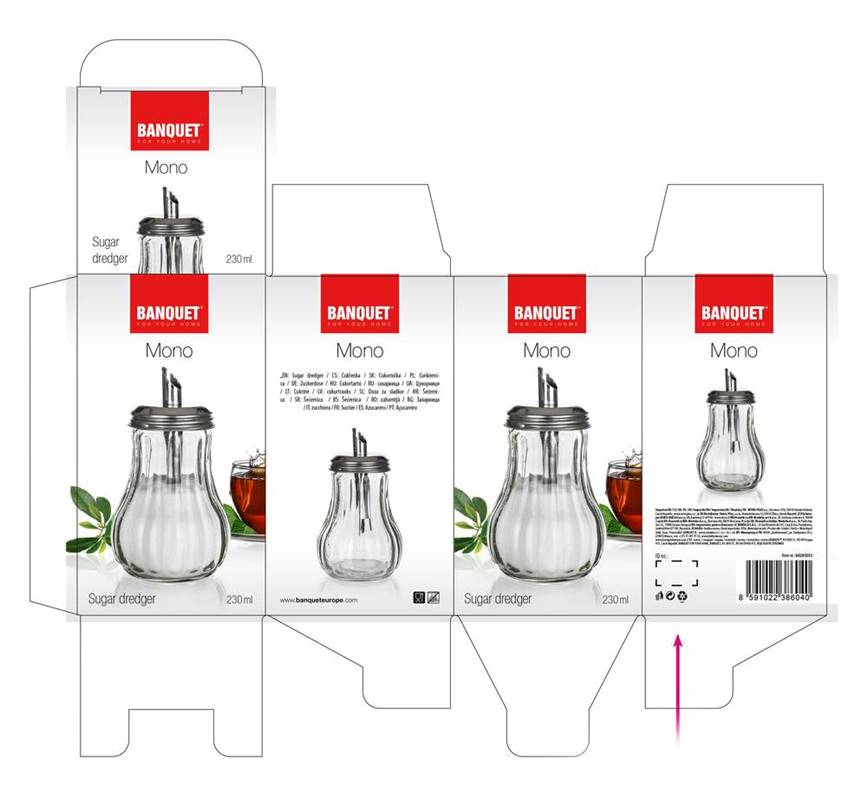 Cukierniczka dozująca MONO 230 ml. Wieczko: stal nierdzewna 18/0, grubość stali nierdzewnej 0,40 mm, korpus: szkło.
