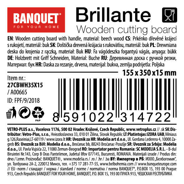 Drewniana deska do krojenia z rękojeścią BANQUET Brillante, wymiary – 155 x 350 x 15 mm, materiał – buk, jakościowe wykonanie, wersja natur.