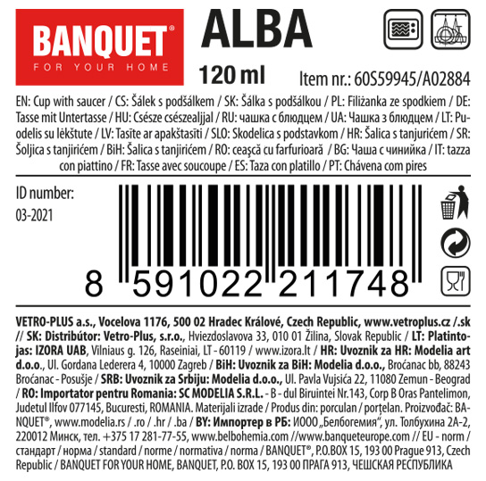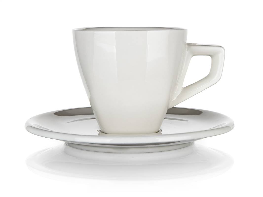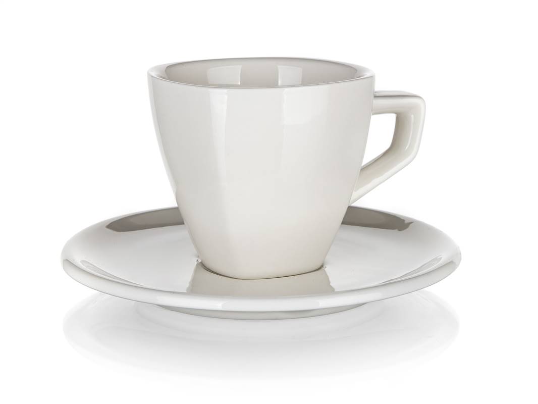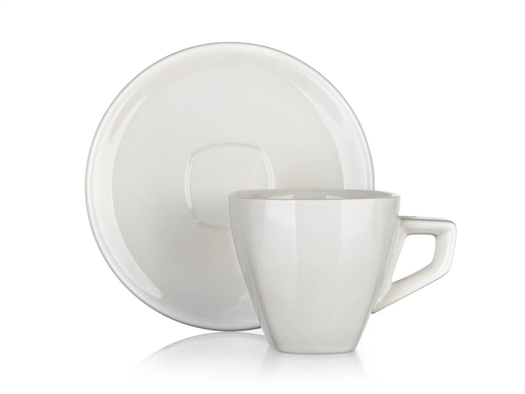 Filiżanka ze spodkiem ALBA 120 ml square, materiał – porcelana z białą glazurą, górna średnica filiżanki 8,2 x 8,2 cm, średnica dolna 4,5 x 4,5 cm, wysokość 7 cm, średnica spodka 14,5 cm. Fispo jest odpowiednie do jednostek gastronomicznych, można myć w zmywarce do naczyń.