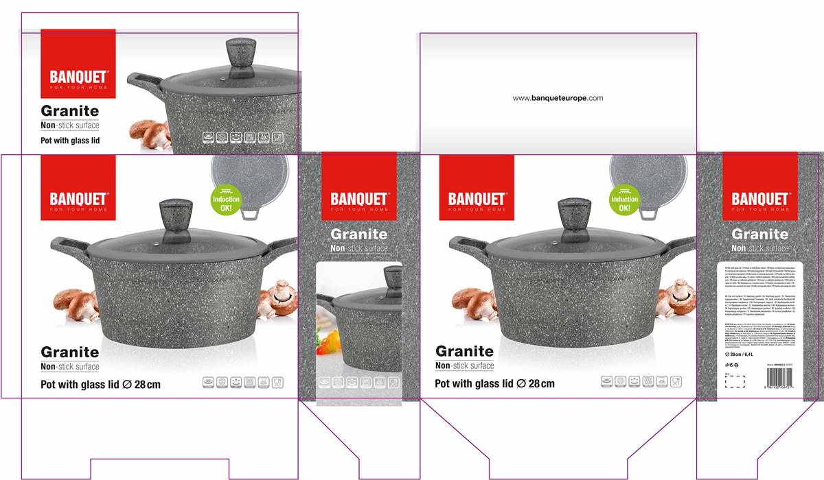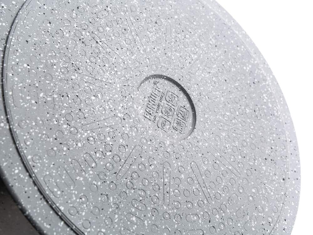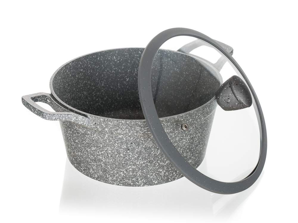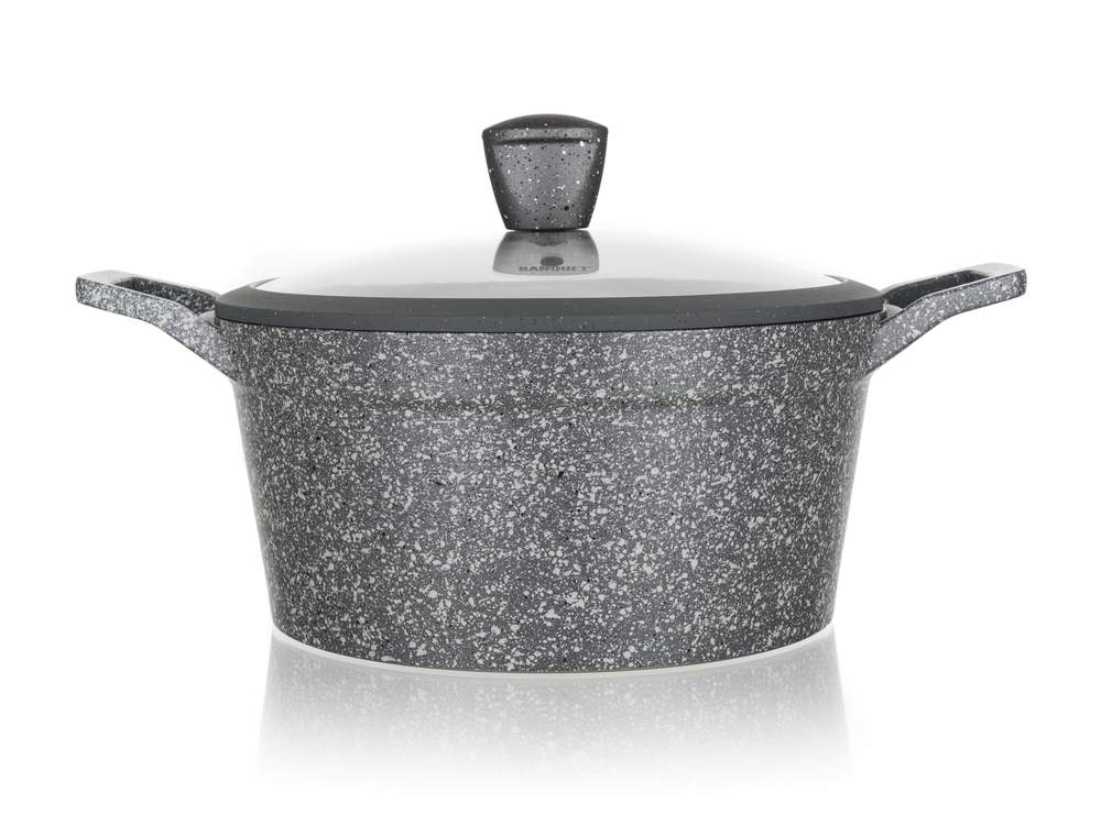 Aluminiowy garnek odlewany Granite grey o średnicy 28 cm ze szklaną pokrywą, która jest wyposażona w gałkę z powierzchnią silikonową. Garnek ma powierzchnię nieprzywierającą i jest przeznaczony do codziennego gotowania. Dno indukcyjne całkowicie chronione granitową warstwą ogniotrwałą. Garnek jest odpowiedni do wszelkich rodzajów płyt grzewczych łącznie indukcji.