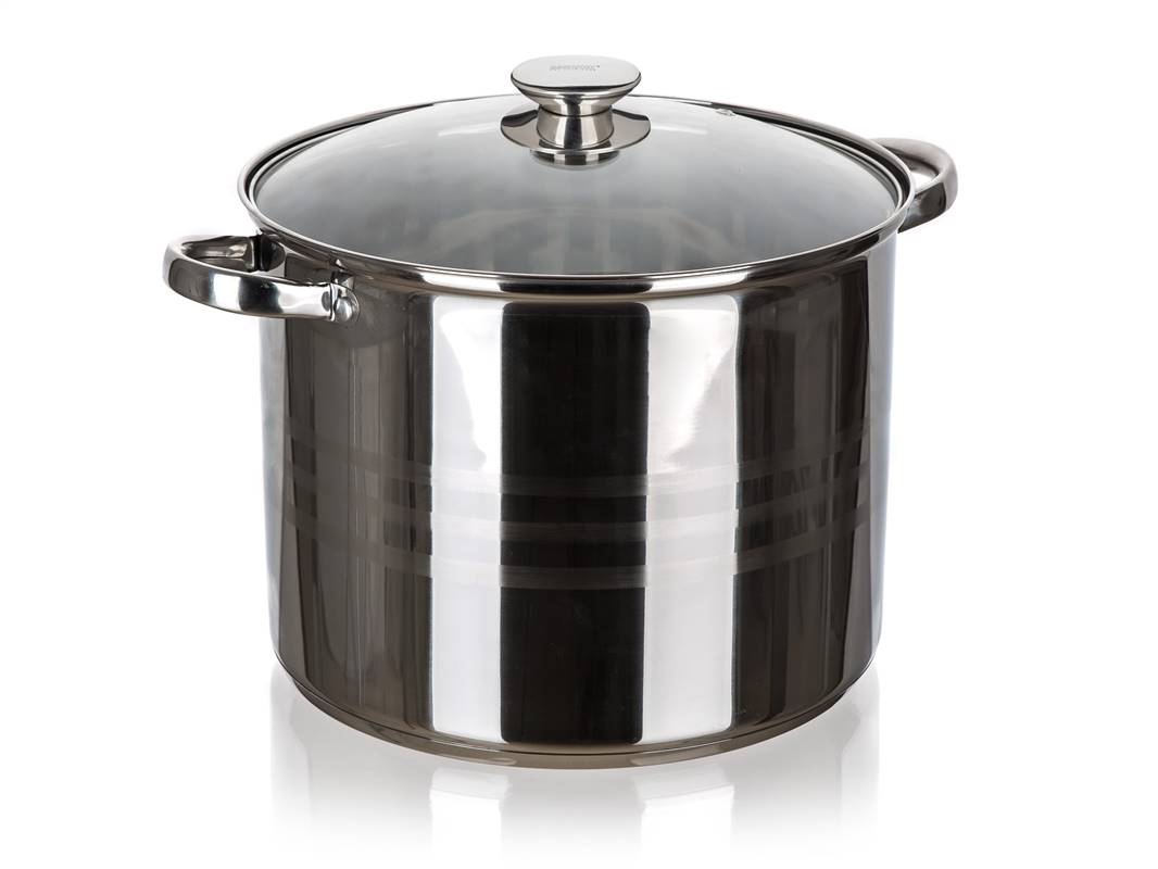 Garnek ze stali nierdzewnej LIVING 13,5 l ze szklaną pokrywą, gałką i uchwytami ze stali nierdzewnej, błyszczącą powierzchnią wewnątrz i na zewnątrz oraz trzema matowymi paskami na zewnątrz. Garnek można wykorzystać do wszelkich rodzajów płyt grzewczych łącznie indukcji. Materiał: stal nierdzewna 201, wymiary: wysokość rondla 22 cm, średnica 28 cm.