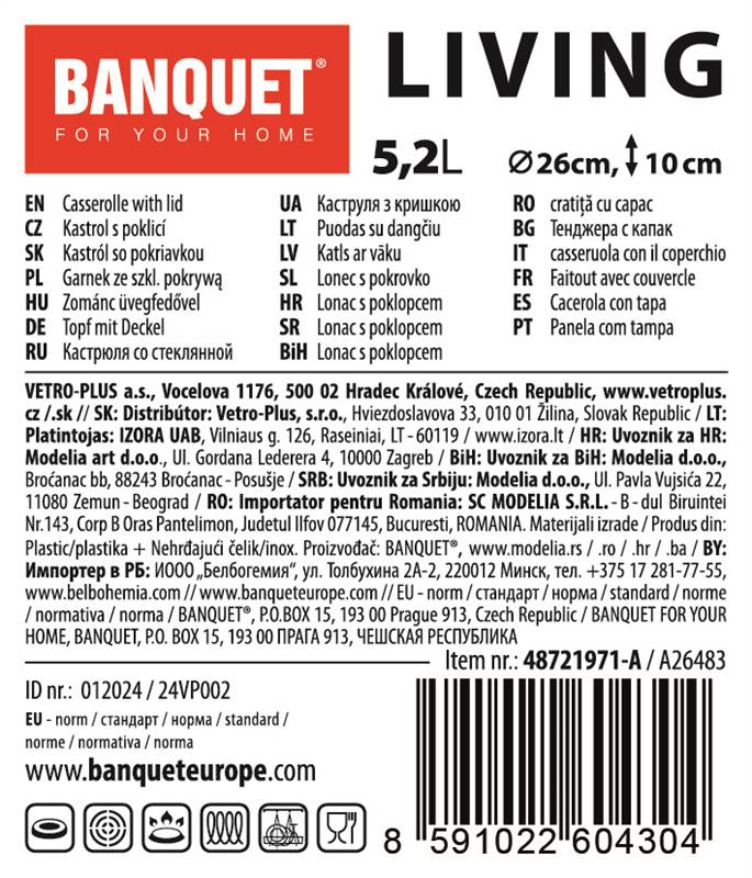 Rondel ze stali nierdzewnej LIVING 5,2 l do przygotowania różnych potraw, jakimi są zupy, sosy itp. Ma szklaną pokrywę, gałkę i uchwyty ze stali nierdzewnej, lśniącą powłokę wewnątrz i na zewnątrz, a od strony zewnętrznej ma trzy matowe pasy. Rondel można wykorzystać na wszystkich rodzajach płyt grzewczych. łącznie indukcji i jest odpowiedni do zmywarki do naczyń. Materiał: stal nierdzewna 201, wymiary: wysokość rondla 10 cm, średnica 26 cm.