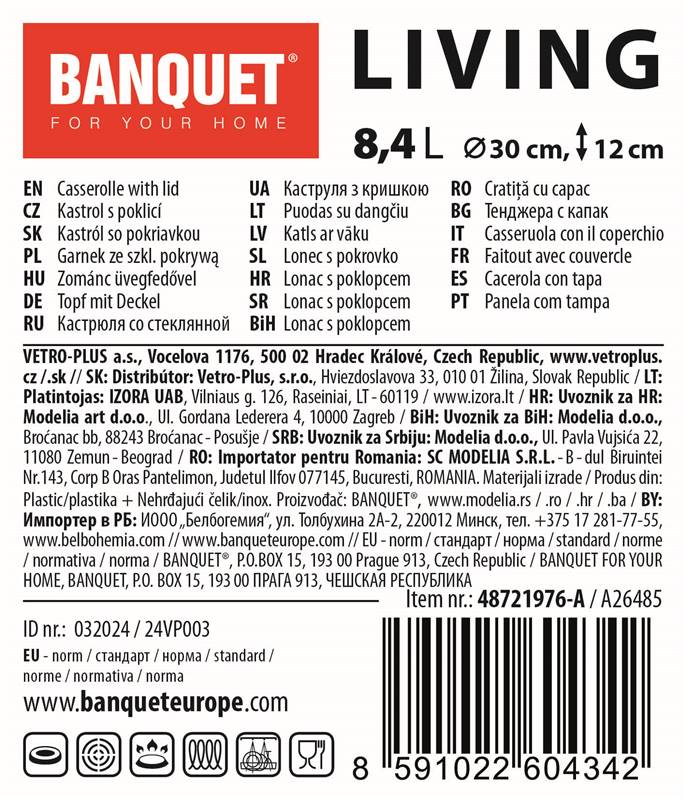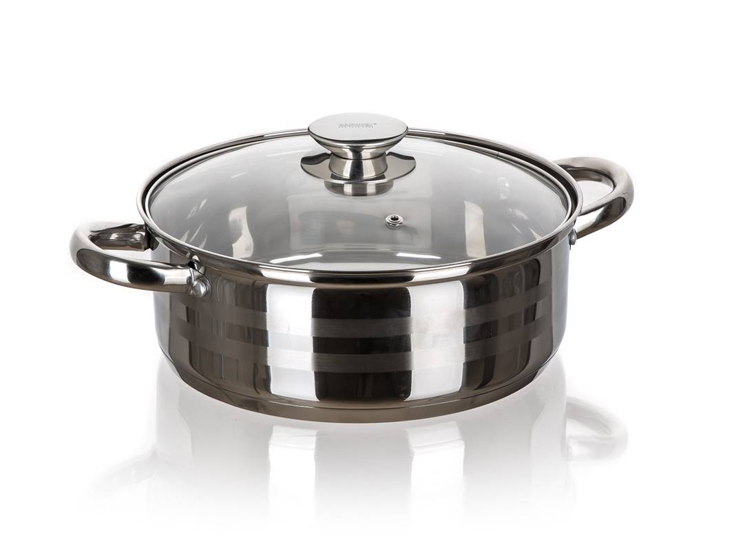 Rondel ze stali nierdzewnej LIVING 8,4 l do przygotowania różnych potraw, jakimi są zupy, sosy itp. Ma szklaną pokrywę, gałkę i uchwyty ze stali nierdzewnej, lśniącą powłokę wewnątrz i na zewnątrz, a od strony zewnętrznej ma trzy matowe pasy. Rondel można wykorzystać na wszystkich rodzajach płyt grzewczych. łącznie indukcji i jest odpowiedni do zmywarki do naczyń. Materiał: stal nierdzewna 201, wymiary: wysokość rondla 12 cm, średnica 30 cm.