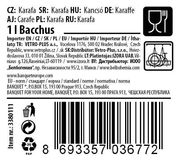 Karafka BACCHUS 1 l jest przezroczystą karafką szklaną z zaznaczoną górną ryską 1 l, wysokość karafki 26,5 cm. Karafa jest odpowiednia do gospodarstw domowych i do jednostek gastronomicznych.