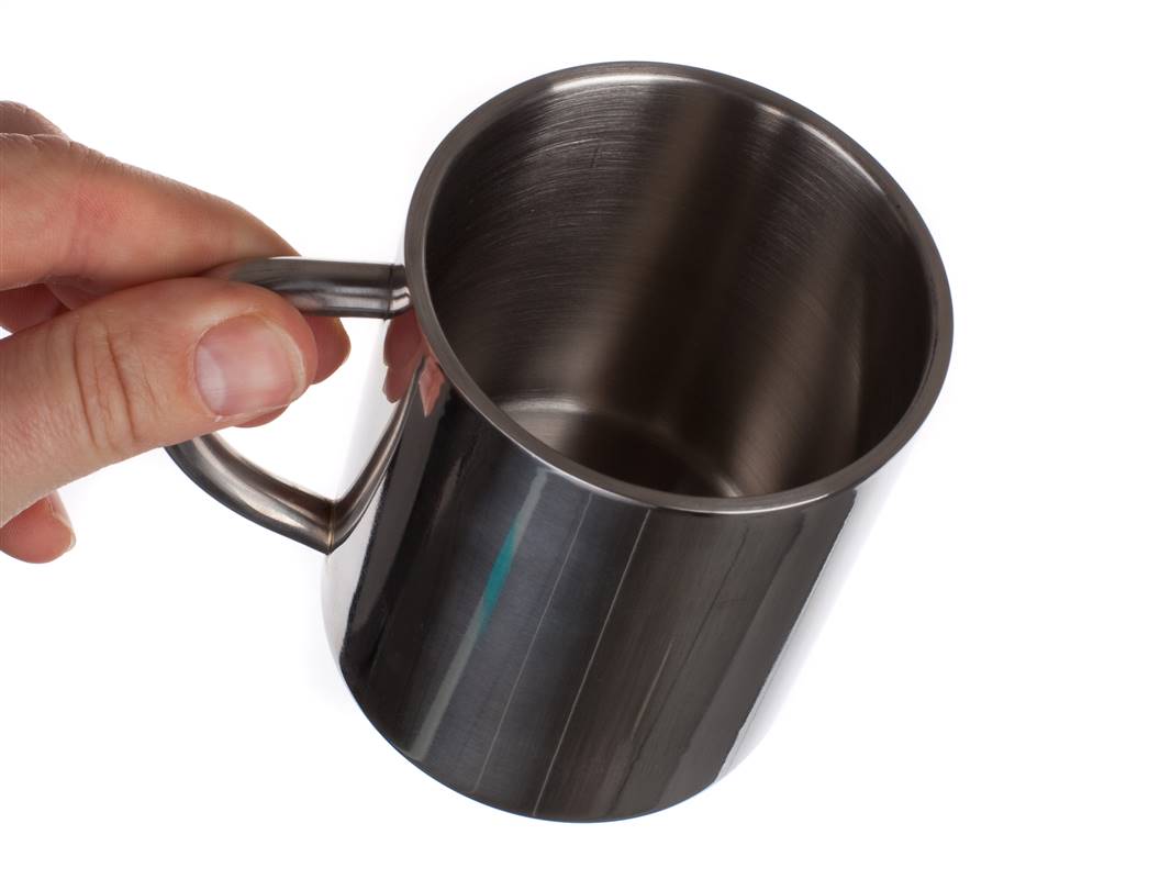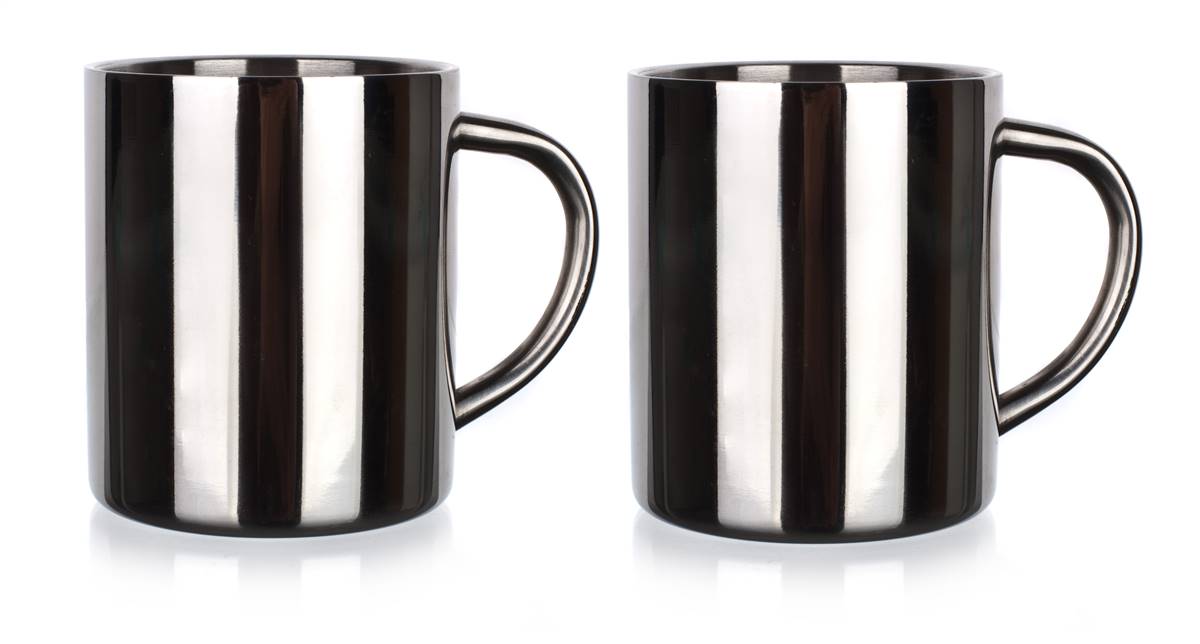 Zestaw dwóch kubków ze stali nierdzewnej o podwójnych ściankach 300 ml, wysokość kubków 9 cm, średnica wewnętrzna 6,9 cm, średnica zewnętrzna 7,3 cm, waga 130 g, pojemność kubka do brzegu 300 ml.