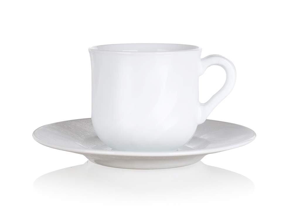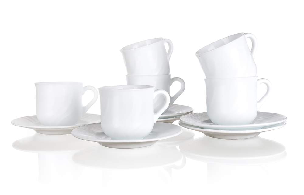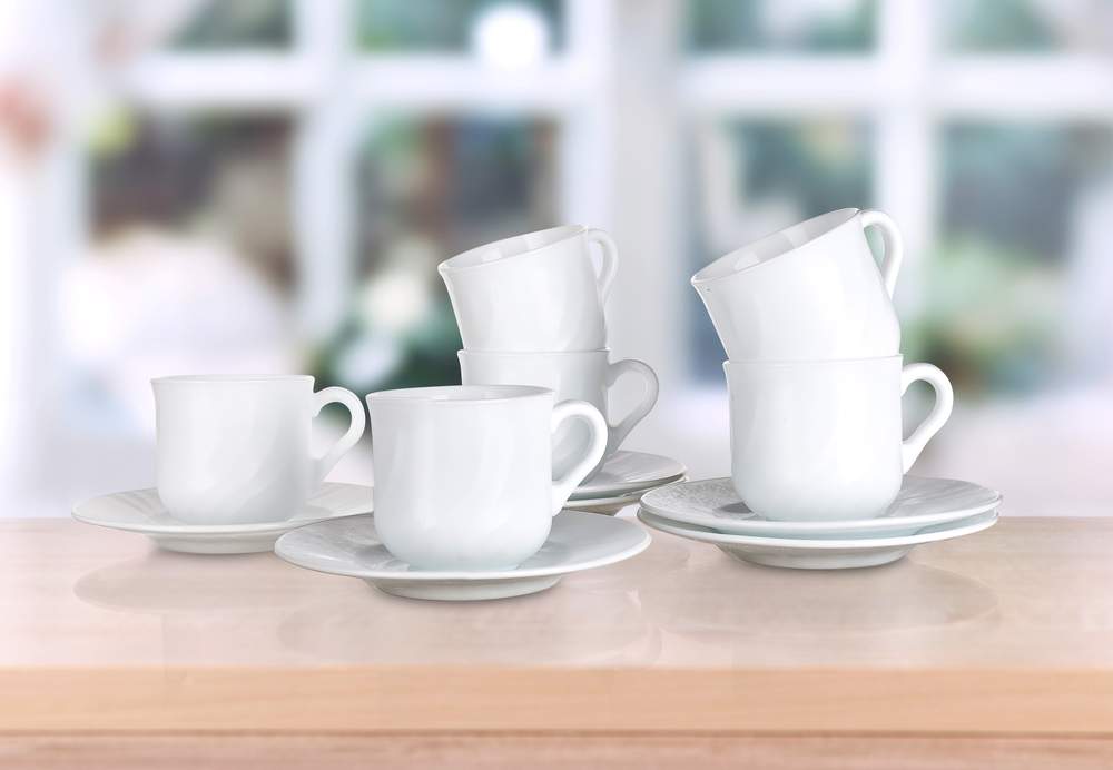 6częśćiowy zestaw filiżanek ze spodkiem 25 cl EBRO, szkło hartowane białego koloru. Wyprodukowane w UE. Naczynie jest bardzo odporne na porysowanie, szoki termiczne, jest nieporowate, co zapobiega osadzaniu się bakterii, utrzymuje temperaturę pokarmów, w 100% nadaje się do recyklingu.