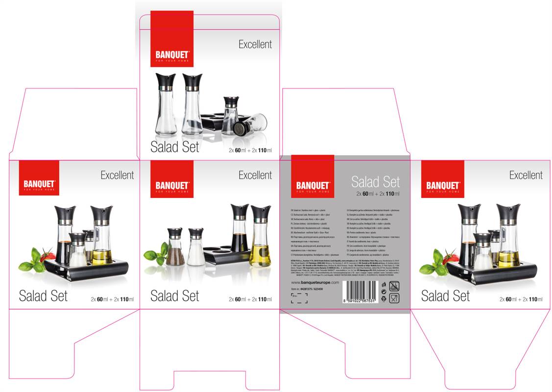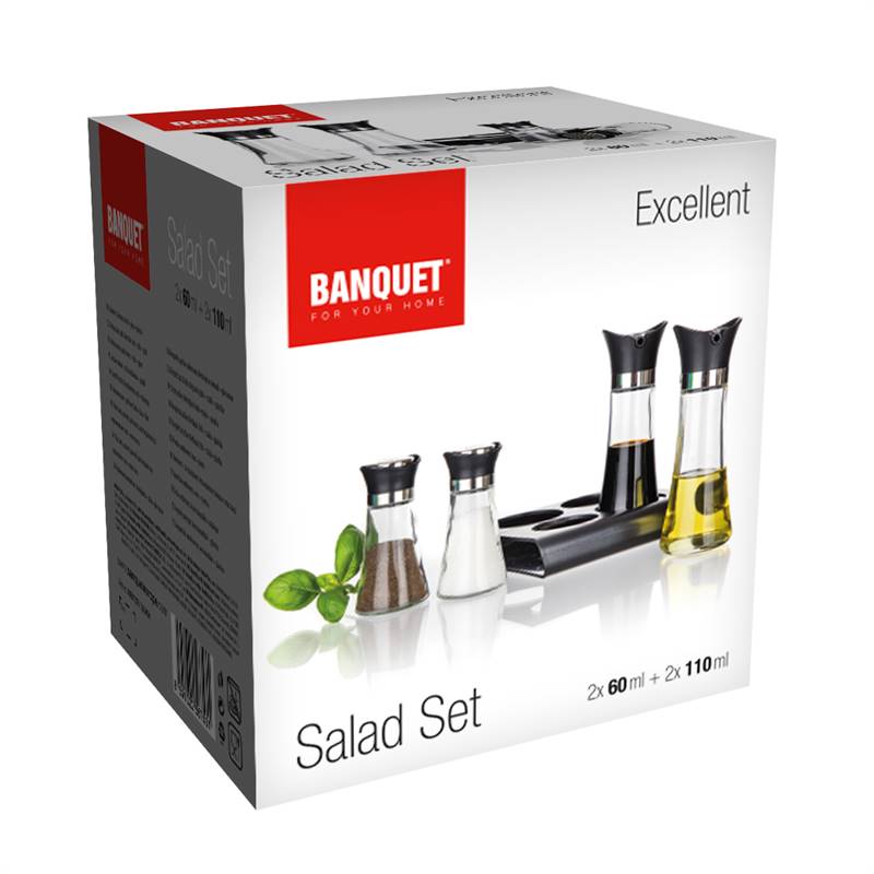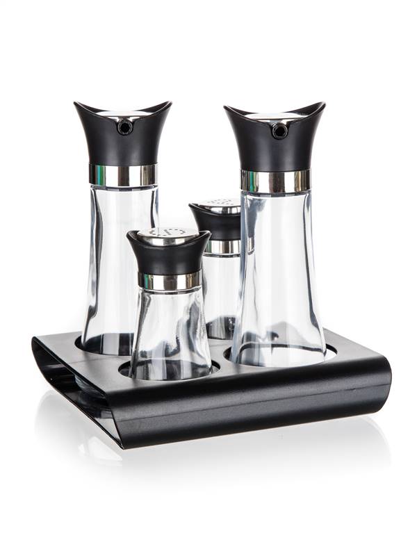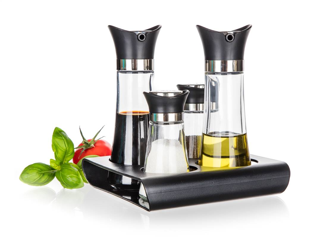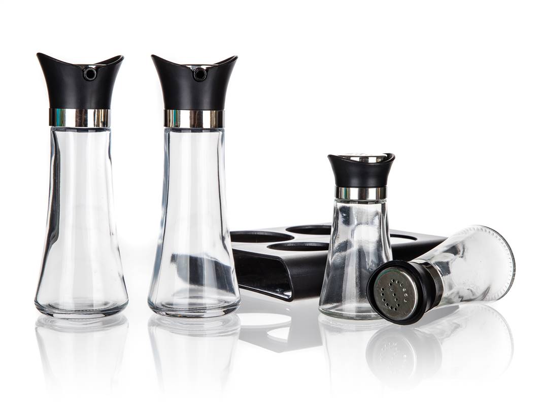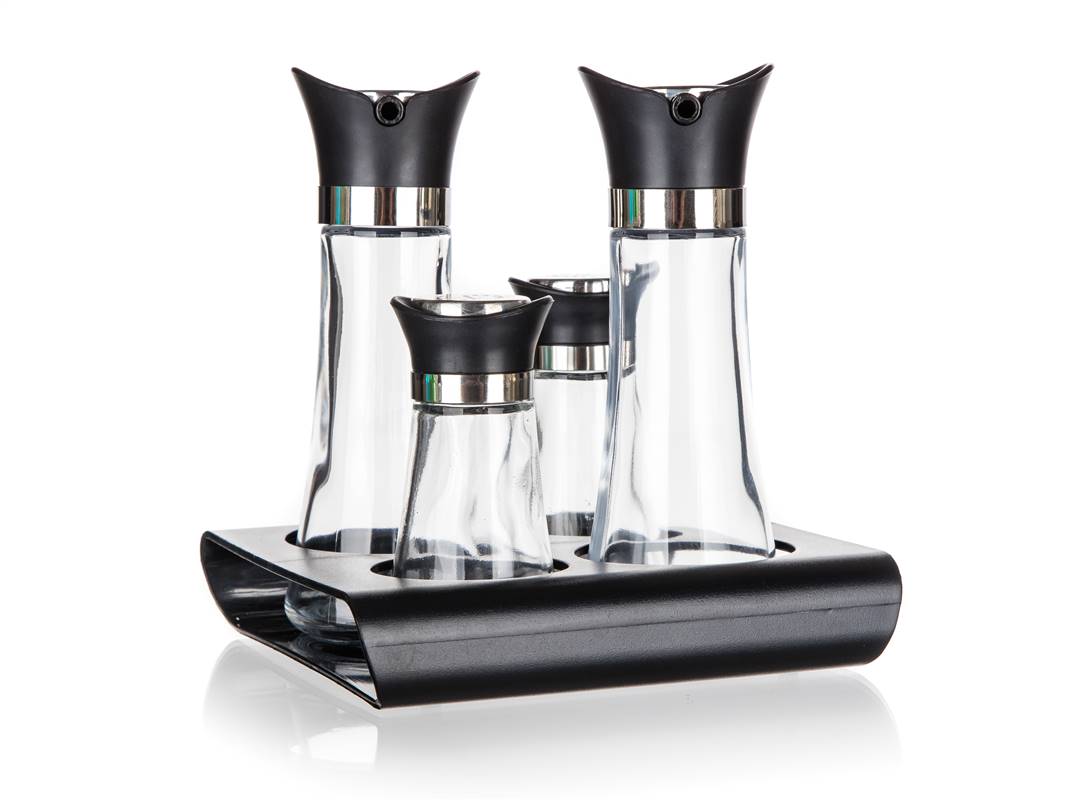 Zestaw przyprawników EXCELLENT 5 szt. to idealne narzędzie w Twojej kuchni do przyprawiania sałatek i innych potraw według własnego smaku. Elementy zestawu: słoik na oliwę czy olej 110 ml, słoik na ocet 110 ml, solniczka 60 ml, pieprzniczka 60 ml oraz podstawka.