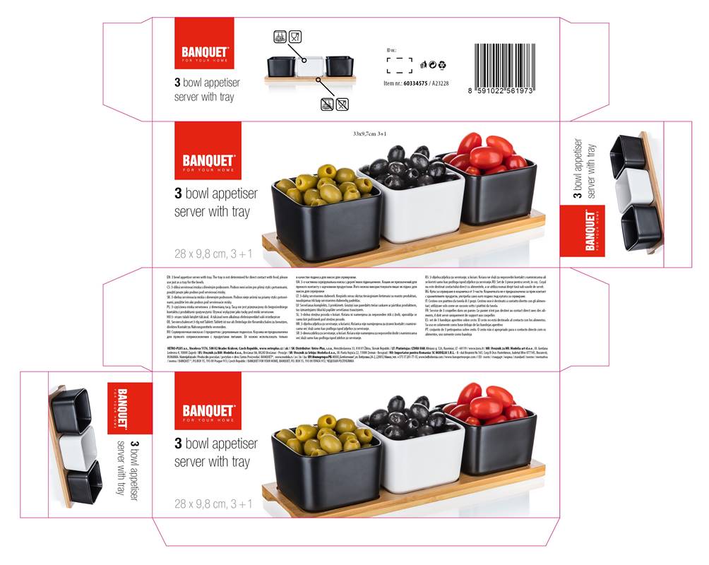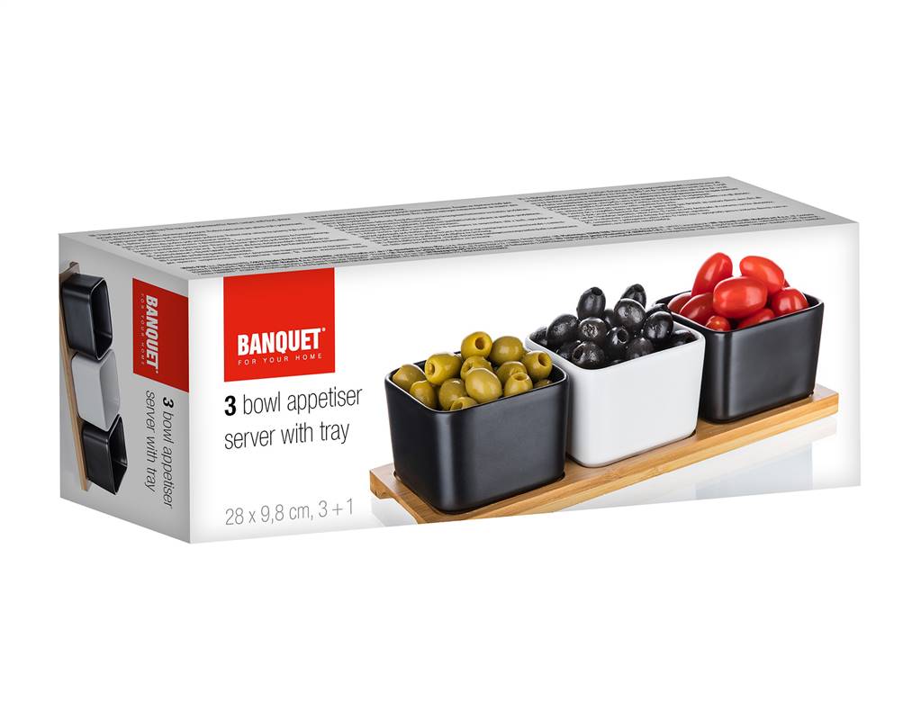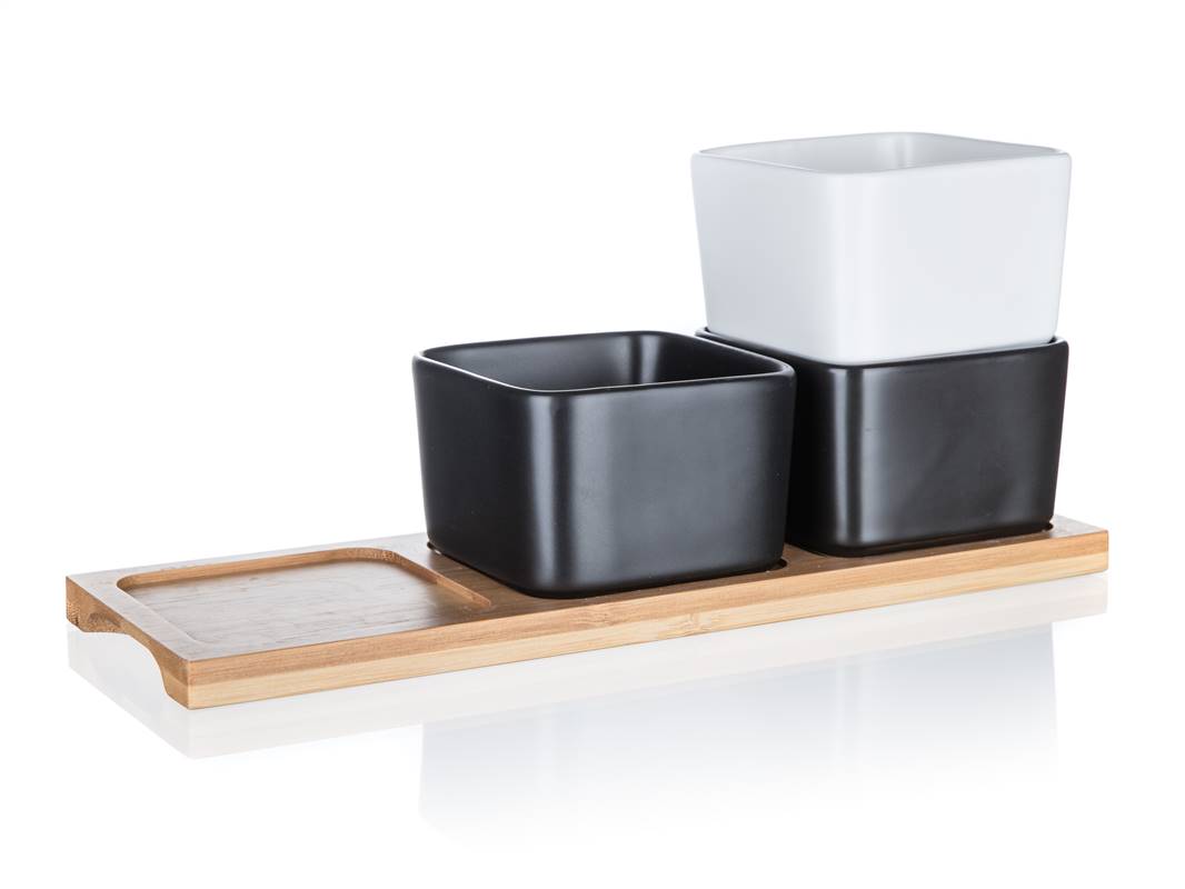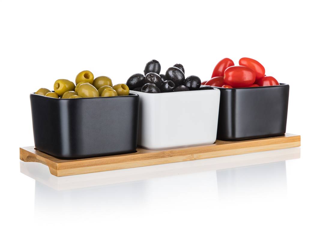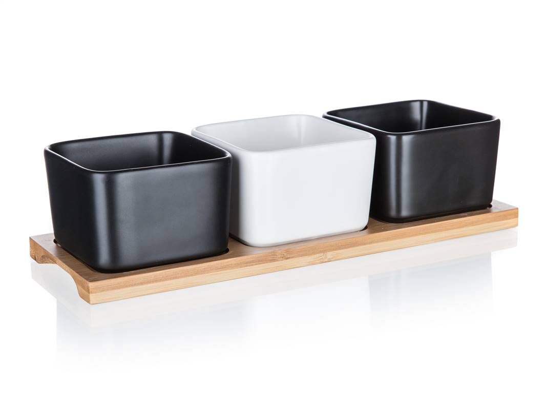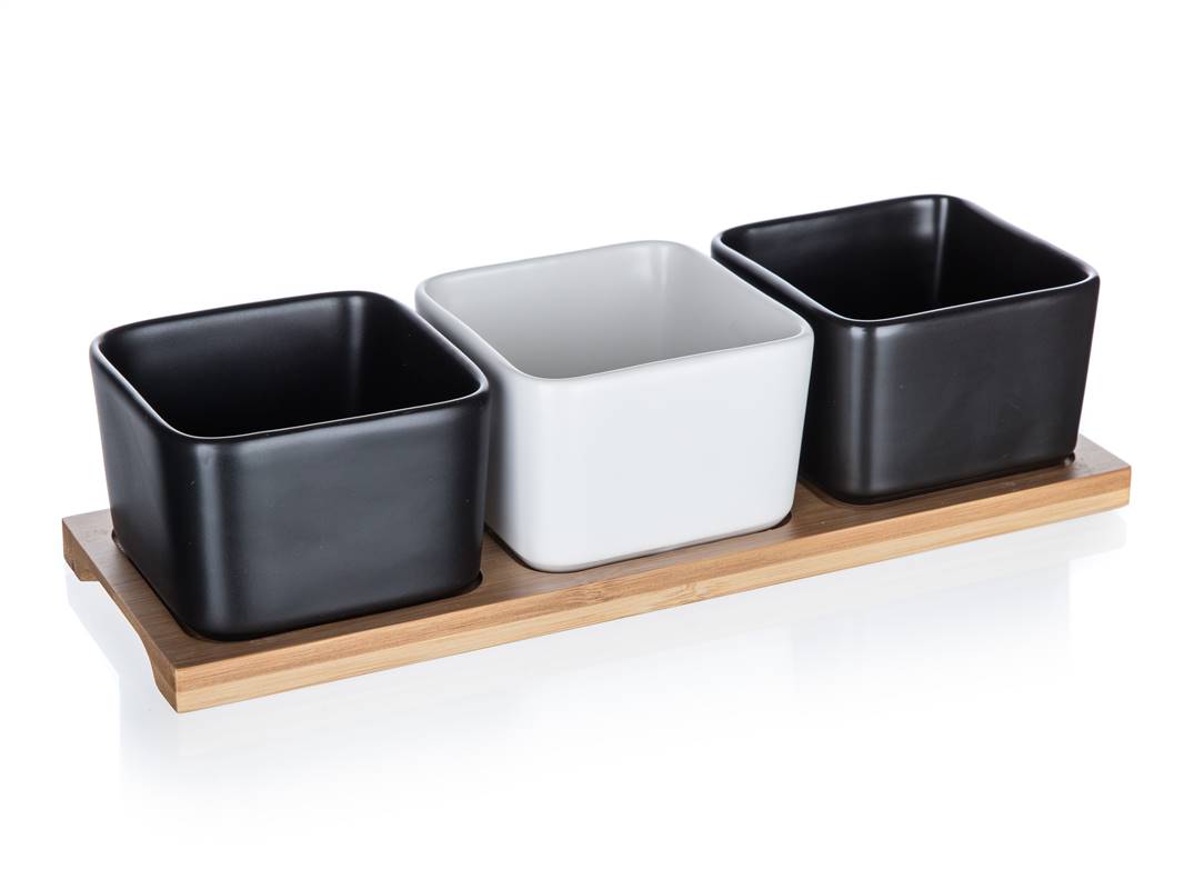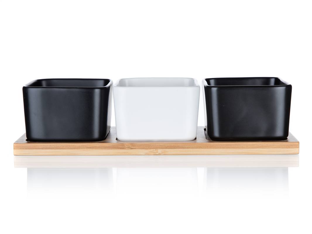 Zestaw 3 kanciastych porcelanowych miseczek, 2 w kolorze czarnym i 1 w kolorze białym na bambusowej tacy o wymiarach 28,2 x 9,8 x 6 cm jest idealny do serwowania różnego rodzaju orzechów, suszonych owoców, oliwek itp.