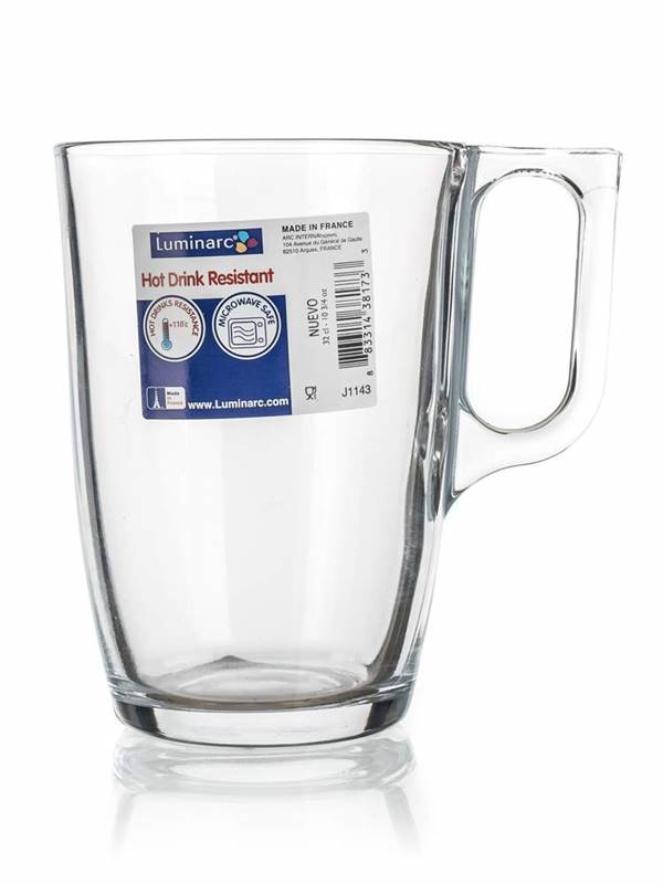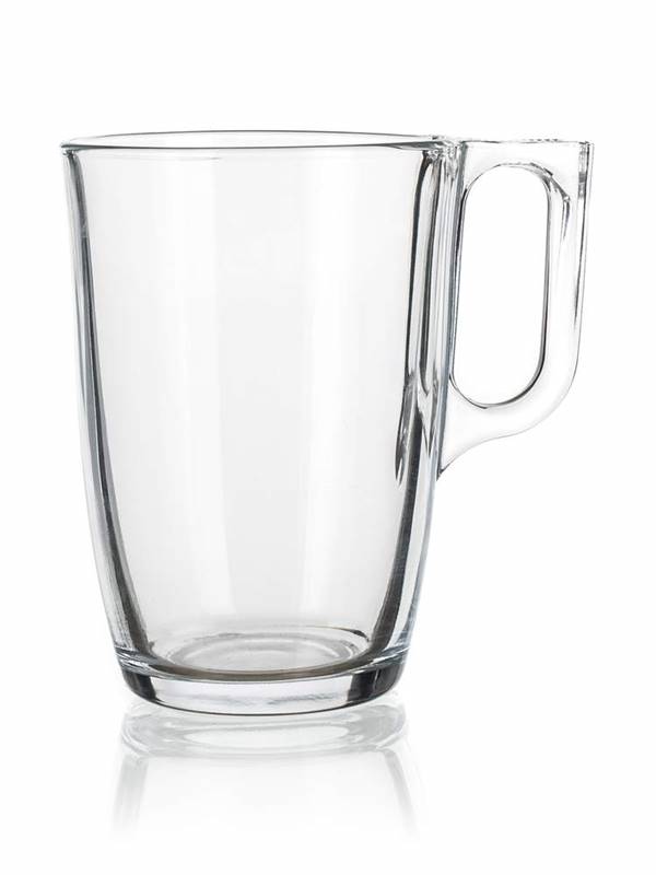 Filiżanka szklany NUEVO MUG 320 ml to elegancka filiżanka z gładkiego szkła przezroczystego, wysokość 11,3 cm. Naczynie jest bardzo odporne na porysowanie, szoki termiczne, jest nieporowate, co zapobiega osadzaniu się bakterii, utrzymuje temperaturę pokarmów, w 100% poddawana recyklingowi. W ofercie mamy także kubki z objętością 400 ml.