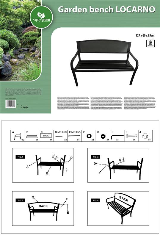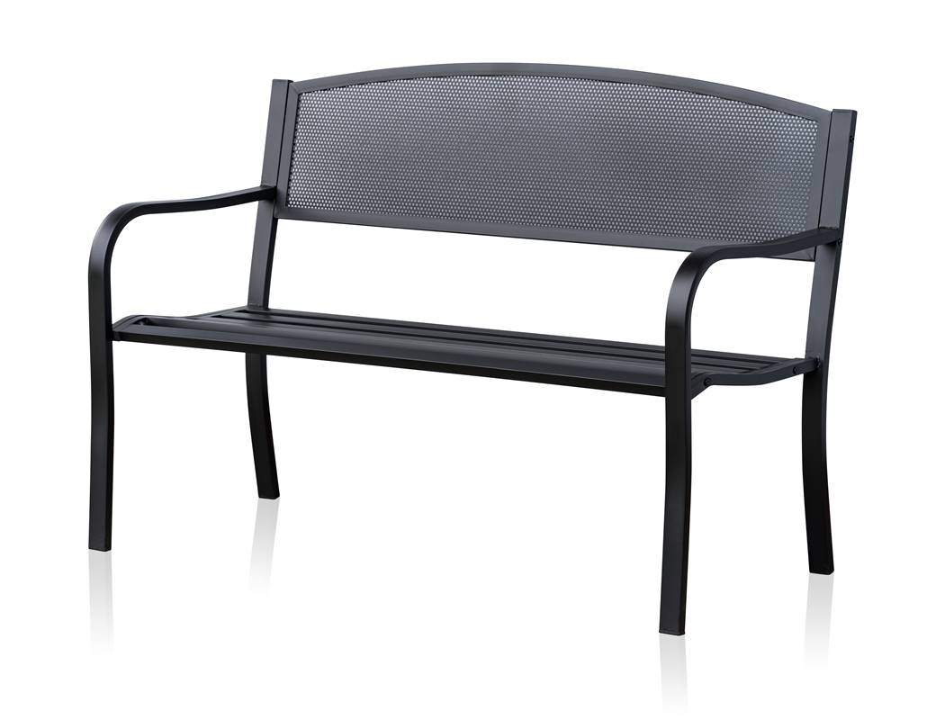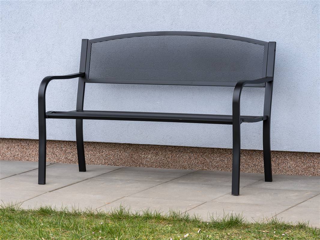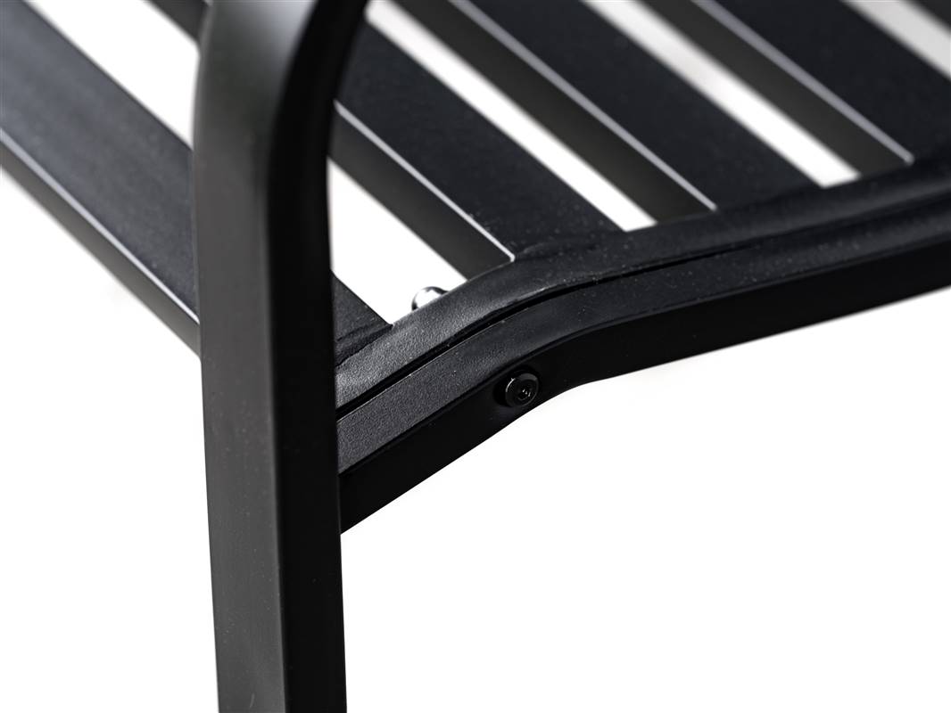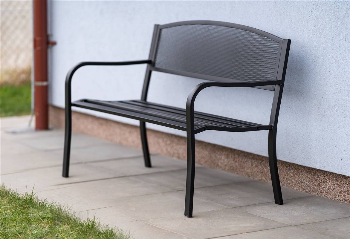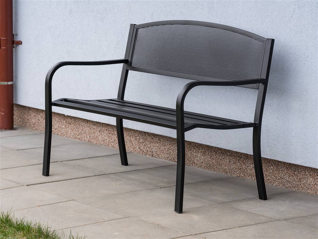 Ławka ogrodowa LOCARNO wykonana jest ze stali pokrytej warstwą czarnej farby proszkowej. W części do siedzenia znajduje się 6 listew o wymiarach 40 x 20 mm. Wymiar ławki: 127 x 60 x 85 cm. Nośność ławki: 150 kg. W celu ułatwienia transportu ławka dostarczana jest w stanie zdemontowanym.
