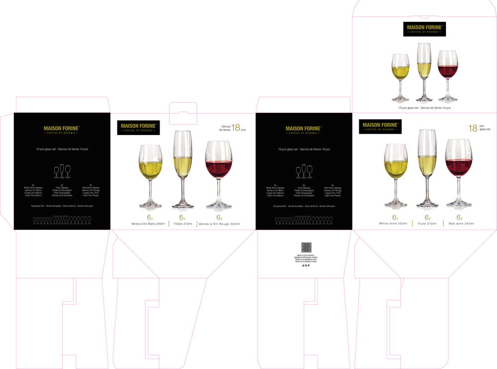18częściowy zestaw kieliszków w opakowaniu MAISON FORINE składa się z 6 szt. kieliszków do wina białego 240 ml, 6 szt. kieliszków do szampana 210 ml, 6 szt. kieliszków do wina czerwonego 340 ml. Kieliszki są wyprodukowane z bardzo jakościowego szkła produkcji czeskiej.