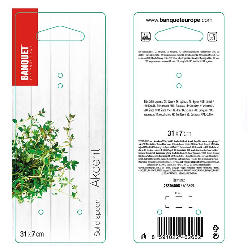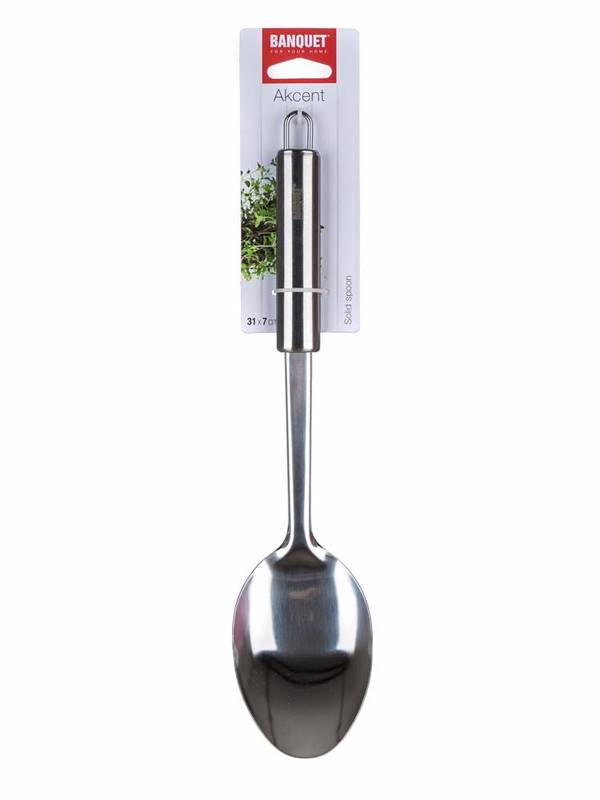 Łyżka AKCENT 31 x 7 cm wyprodukowana ze stali nierdzewnej, przeznaczona do wykorzystania profesjonalnego i w gospodarstwach domowych. Łyżka jest wyposażona w praktyczne oczko umożliwiające zawieszenie, łatwo się utrzymuje, można myć w zmywarce do naczyń. Seria naczyń kuchennych AKCENT spełnia trudne wymagania profesjonalistów i jest przeznaczona także do wykorzystania w gospodarstwach domowych. Prosty i funkcjonalny design zapewnia ponadczasową oraz długą moralną i jakościową żywotność wszystkich produktów.