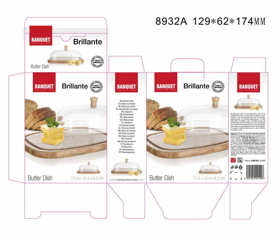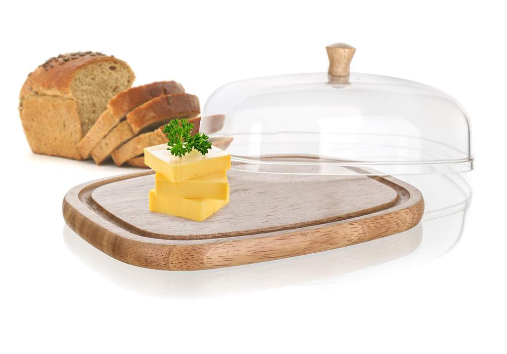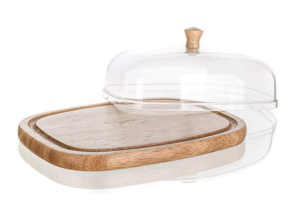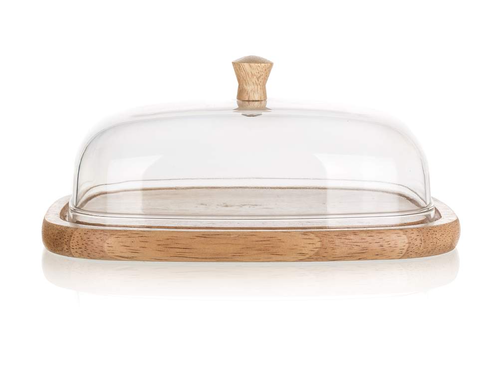 Doza do masła i serów BRILLANTE o wymiarach 17,4 x 12,4 x 6,2 cm, tacka z rowkiem z jakościowego drewna eukaliptusowego, akrylowy klosz z drewnianą gałką. Ser przechowywany pod kloszem zostanie o wiele dłużej świeży i nie osycha.