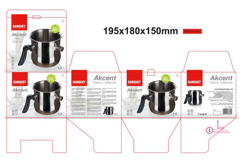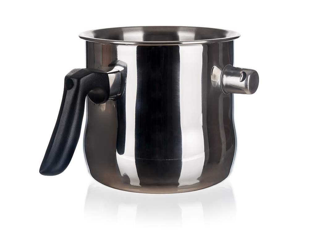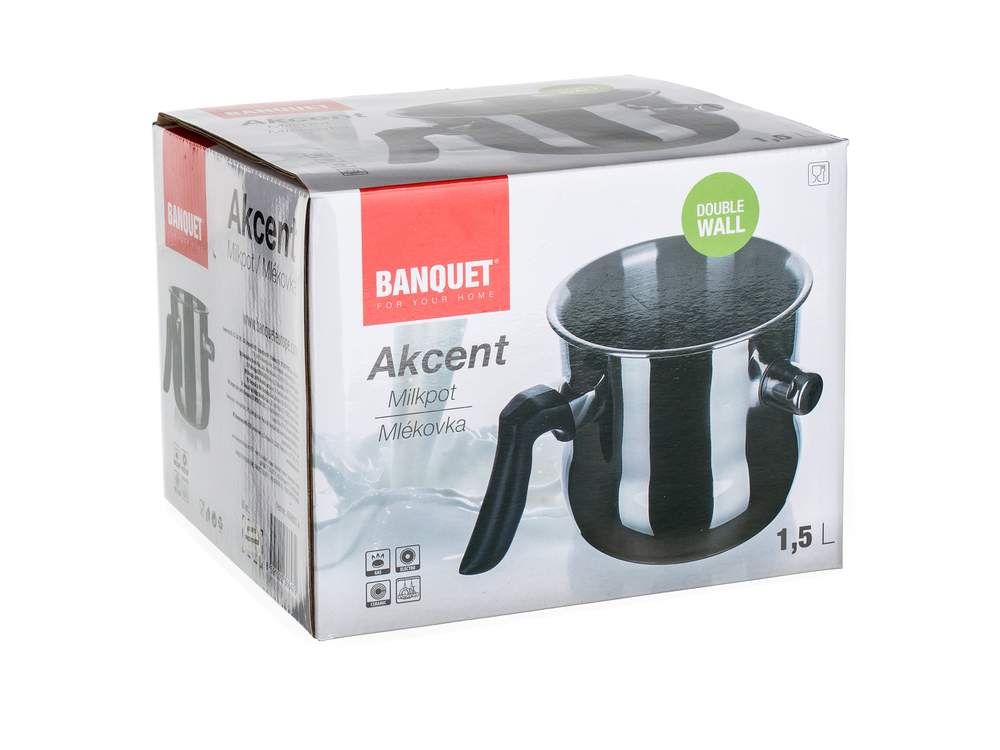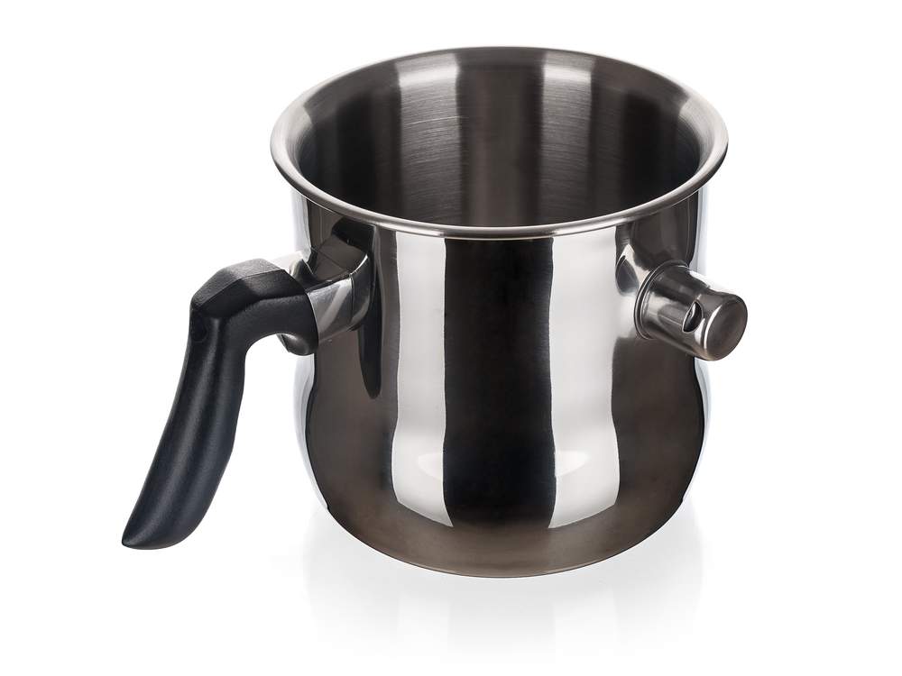 Garnek do mleka ze stali nierdzewnej AKCENT 1,5 l to garnek o podwójnych ścianach bez pokrywy z uchwytem z tworzywa, zewnętrzne wykończenie powierzchni połysk, wewnętrzne mat. Boczna strona garnka zawiera zawór do wprowadzenia wody (podczas wrzenia gwiżdże).