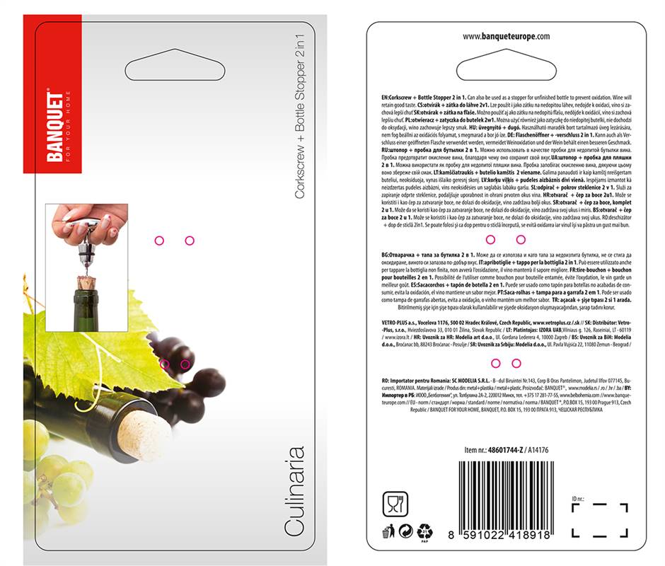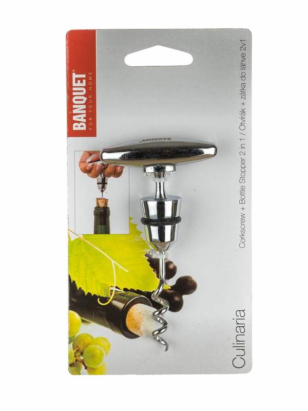 Otwieracz i korek do butelek 2w1 CULINARIA. Korkociąg jest wyprodukowany ze stopu cynku, z wykonaniem pochromowanym, dopełniony o uszczelkę z gumy, służy jako korek do butelek. Uszczelni niedopite wino, będziesz więc mógł/mogła delektować się winem nawet po kilku dniach.