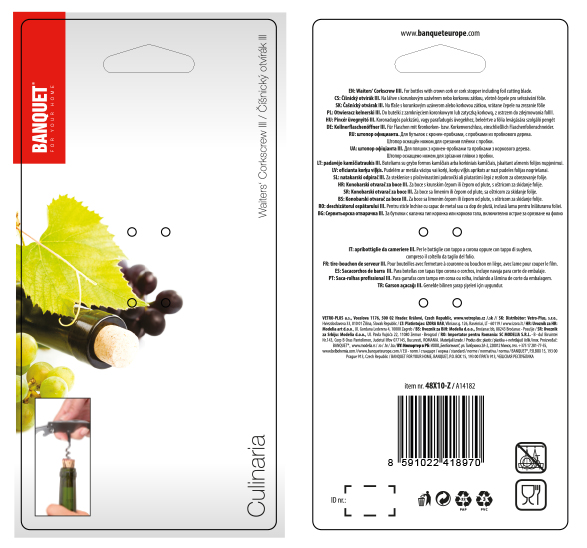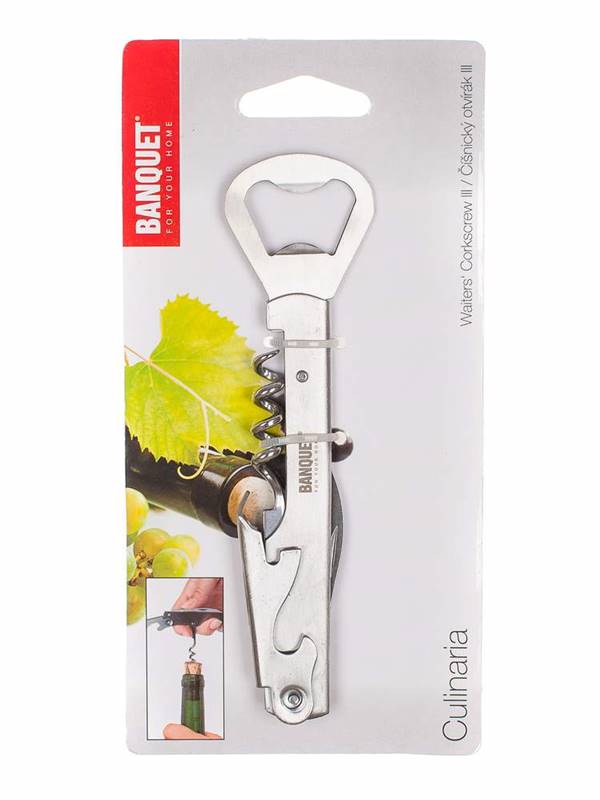 Korkociąg kelnerski III. CULINARIA, uniwersalny otwieracz / nóż do butelek w wykonaniu ze stali nierdzewnej, długość 14 cm, masa 67 g. Znajdzie wykorzystanie podczas otwierania butli z klasycznym korkiem, ale także z koronką.
