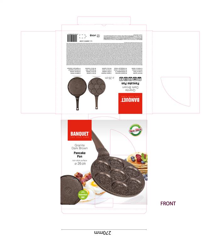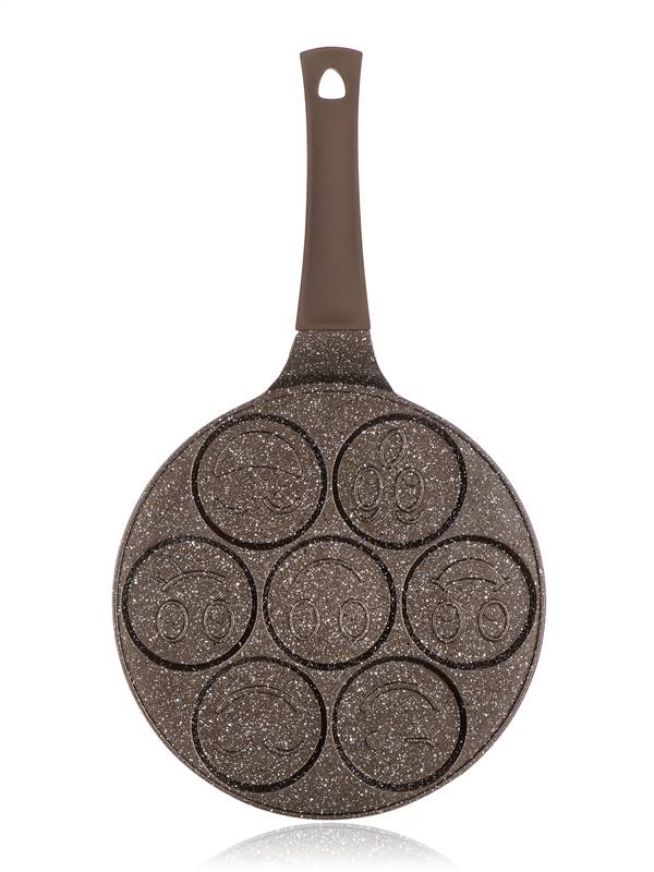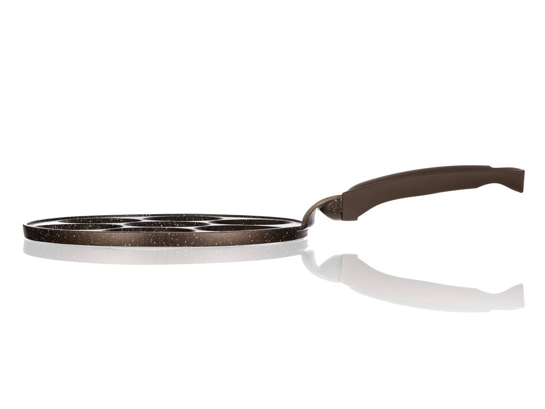 Aluminiowa patelnia lana do pancakes GRANITE BROWN o średnicy 26 cm, przeznaczona do pancakes. Patelnia ma wewnętrzną 2-warstwową powierzchnię antyadhezyjną z brązowego marmuru i dno indukcyjne z 2-warstwową powłoką żaroodporną. Patelnia ma 7 form do pancakes, średnica 1 formy ma 8 cm.