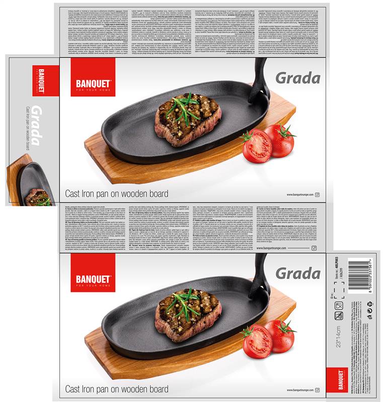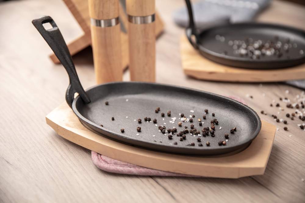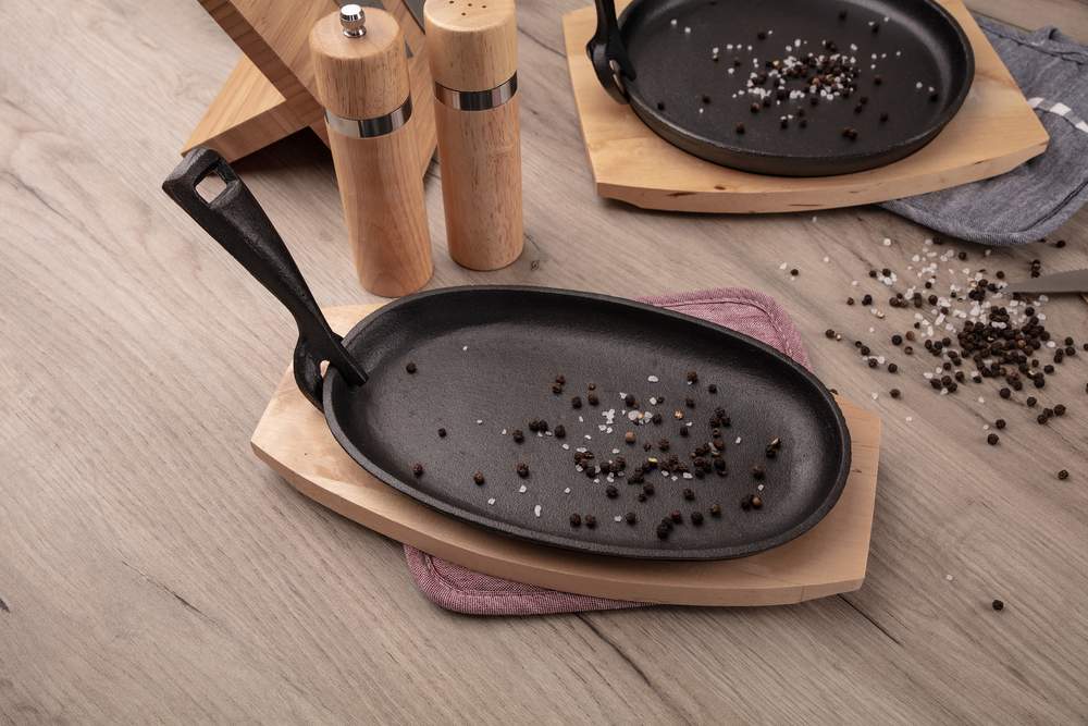 Patelnia żeliwna 23 x 14 cm na drewnianej deseczce, zdejmowalny uchwyt żeliwny do wyciągania patelni z piekarnika. Patelnia jest przeznaczona do zapiekania potraw, może być wykorzystana do bezpośredniego serwowania, deseczka drewniana służy jako podkładka pod gorącą patelnię. Patelnia może być wykorzystana do bezpośredniego serwowania, deseczka drewniana służy jako podkładka pod gorącą patelnię.