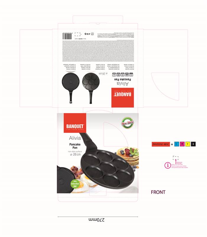 Aluminiowa patelnia odlewana do naleśników ALIVIA 26 cm ma wewnętrzną powłokę antyadhezyjną i jest odpowiednia do wszystkich rodzajów kuchenek łącznie indukcji. Patelnia do naleśników może zostać wykorzystana do smażenia naleśników, omletów i placków ziemniaczanych o średnicy 8 cm.