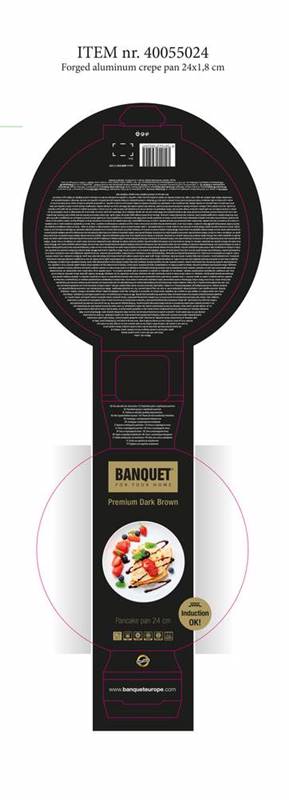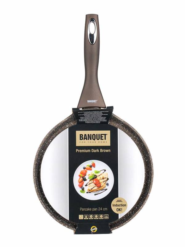Aluminiowa, odlewana, kuta patelnia do naleśników PREMIUM DARK BROWN z powłoką antyadhezyjną, wymiar 24 x 1,6 cm, ciemnobrązowy wzór granitowy, grubość ściany 3 mm, dno w pełni indukcyjne, rękojeść soft-touch. Powierzchnia nieprzylegająca jest bardzo twarda i wytrzymała na porysowania. Patelnia jest odporna na uderzenia i odkształcanie. Patelnia jest odpowiednia do wszelkich rodzajów kuchenek łącznie indukcji.