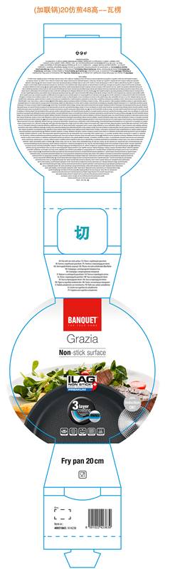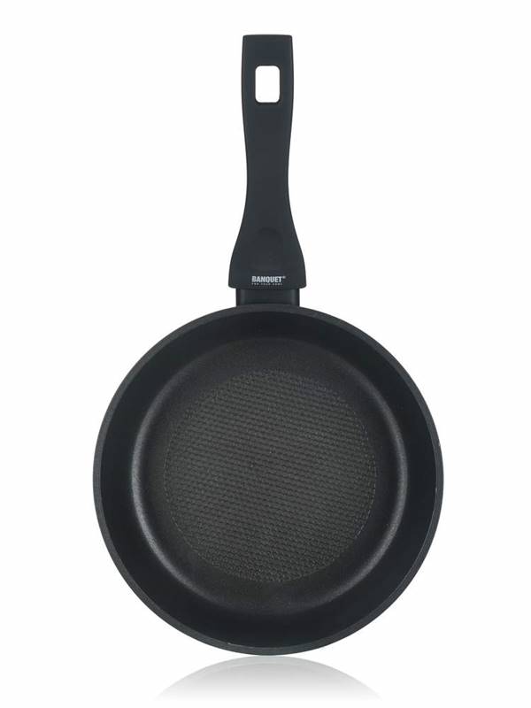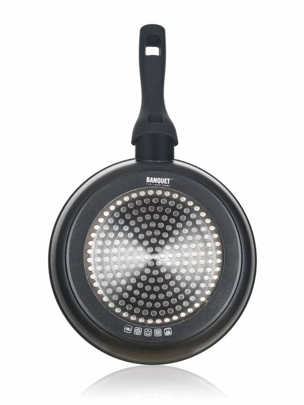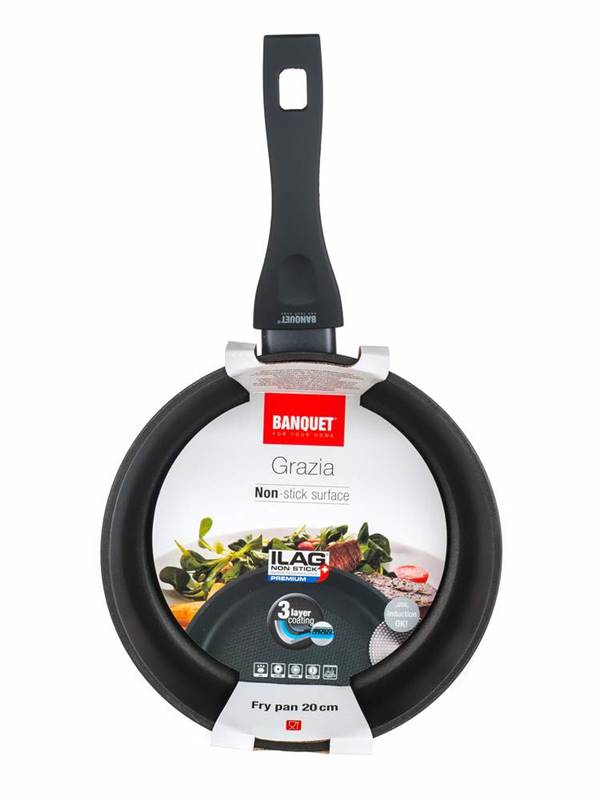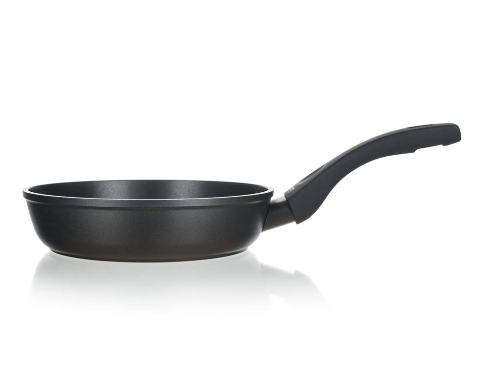 Patelnia aluminiowa kuta GRAZIA o wymiarach 20 x 4,9 cm ze szklaną pokrywką, 3warstwową powłoką antyadhezyjną ILAG PREMIUM, zewnętrznym 2warstwowym natryskiem żaroodpornym, kolor czarny matowy, grubość ściany 4,0 mm, dno indukcyjne z piktogramowym