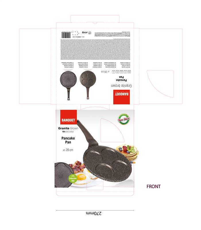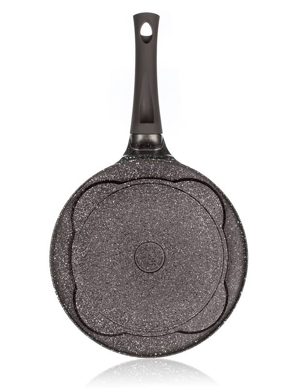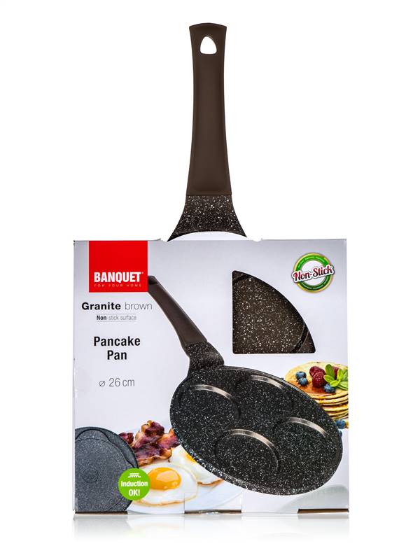 Patelnia aluminiowa Granite Dark Brown do 4 pancakes o średnicy 26 cm ma wysokiej jakości antyadhezyjną powłokę wewnętrzną i ergonomiczną rączką z plastiku z soft touch wykończeniem. Patelnia jest odpowiednia do wszystkich rodzajów płyt kuchennych, w tym indukcji. Pancakes, jajka sadzone lub placki ziemniaczane przygotujesz z minimalną ilością tłuszczu.