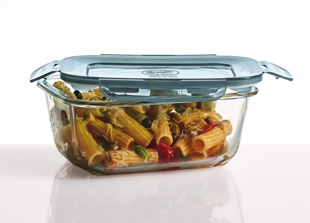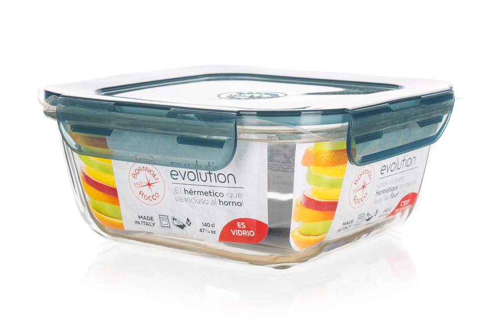 Doza EVO 1400 ml, można ją hermetycznie zamknąć, szklane naczynie, które doskonale nadaje się do piekarnika a dzięki specjalnemu wieku nadaje się idealnie do transportu pokarmów. W ofercie kilka rozmiarów.