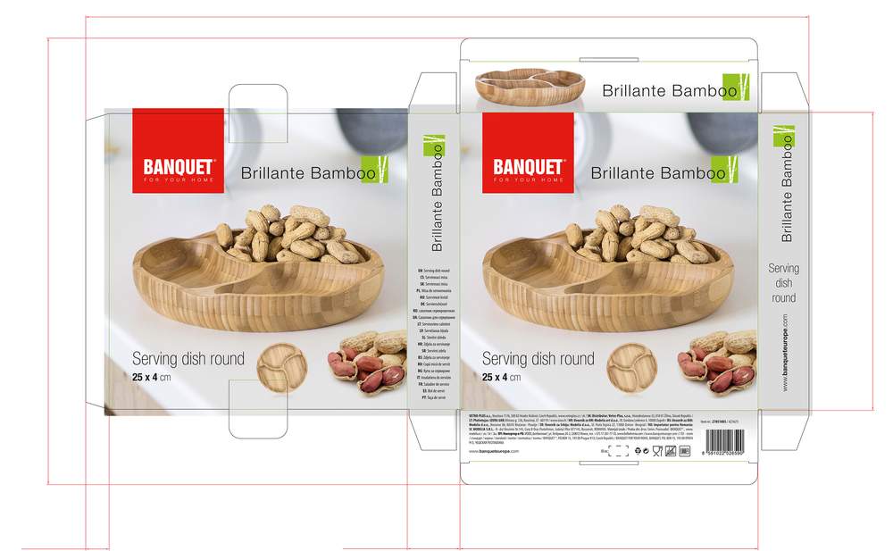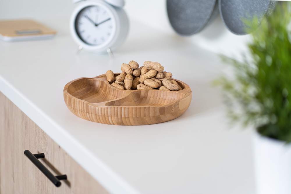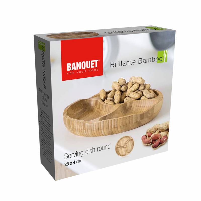 Miska dzielona Bamboo Brillante wyprodukowana z naturalnego bambusu, jest idealna do serwowania różnych dobroci. Dzięki dzielonym drewnianym przegrodom można serwować więcej rodzajów smakołyków na jednej misce. Wymiary: 25 x 4 cm.