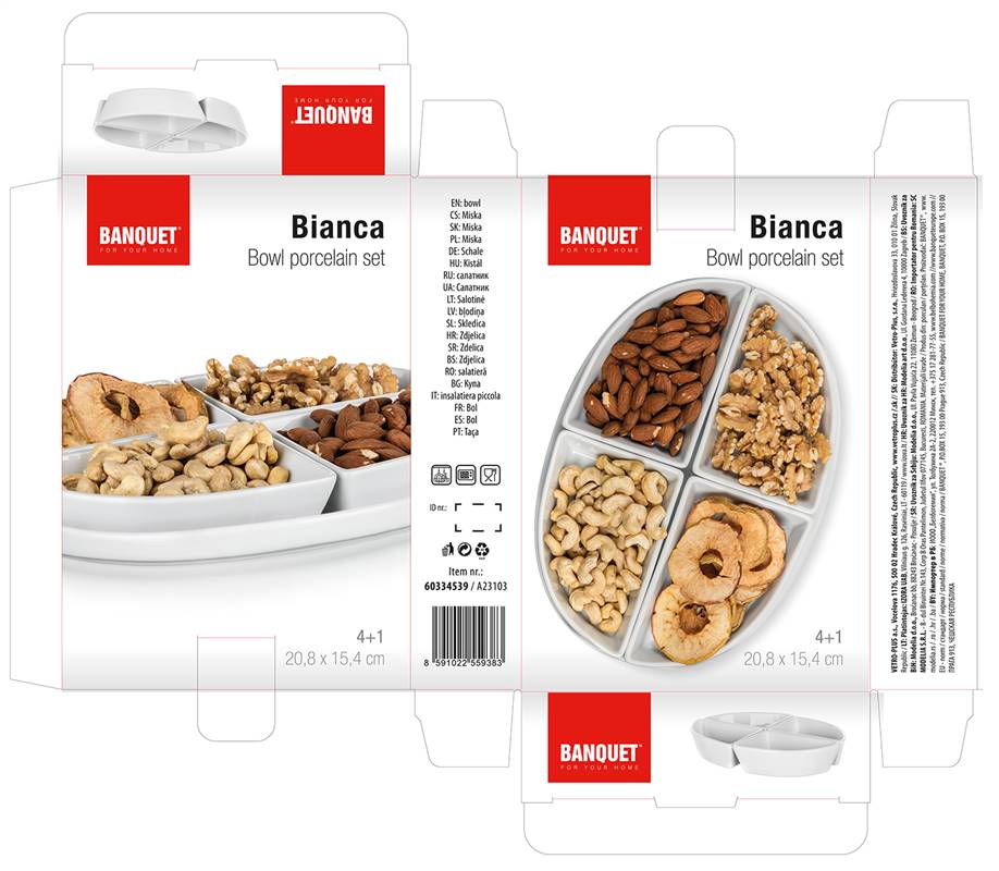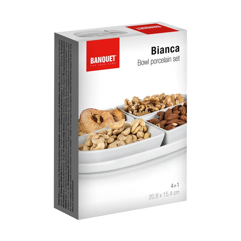 Zestaw do serwowania owalny z porcelany BIANCA w kolorze białym, składa się z owalnej tacy 19 x 13 cm i 4 miseczek o różnych kształtach. Zestaw ten ma szeroki zakres zastosowań. Taca może być używana do serwowania koreczków, kanapek, ciastek, tortów lub mini torcików. W poszczególnych małych miseczkach można umieścić różne dipy, marmolady, posypki, orzeszki, owoce czy warzywa. Nadaje się do codziennego użytku. Zestaw jest odpowiedni do zmywarki do naczyń.