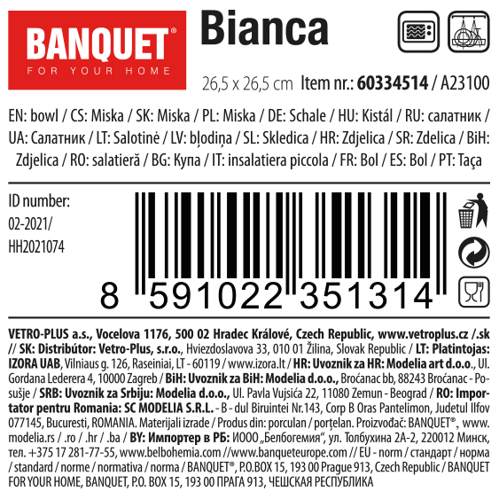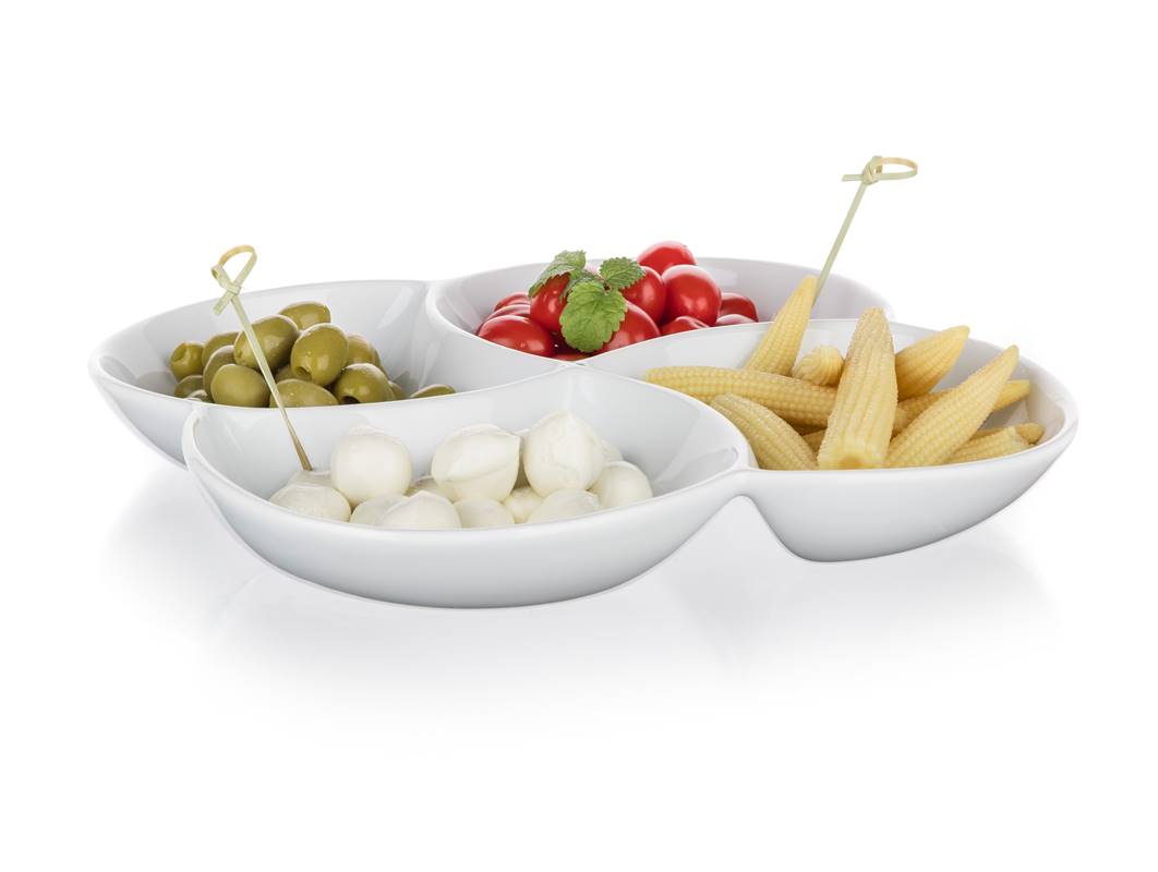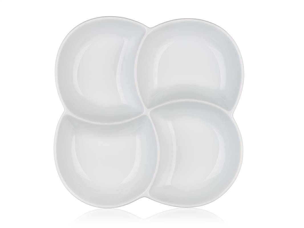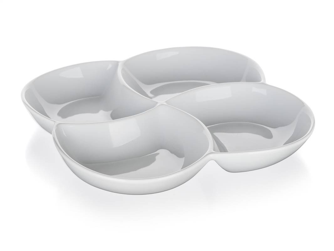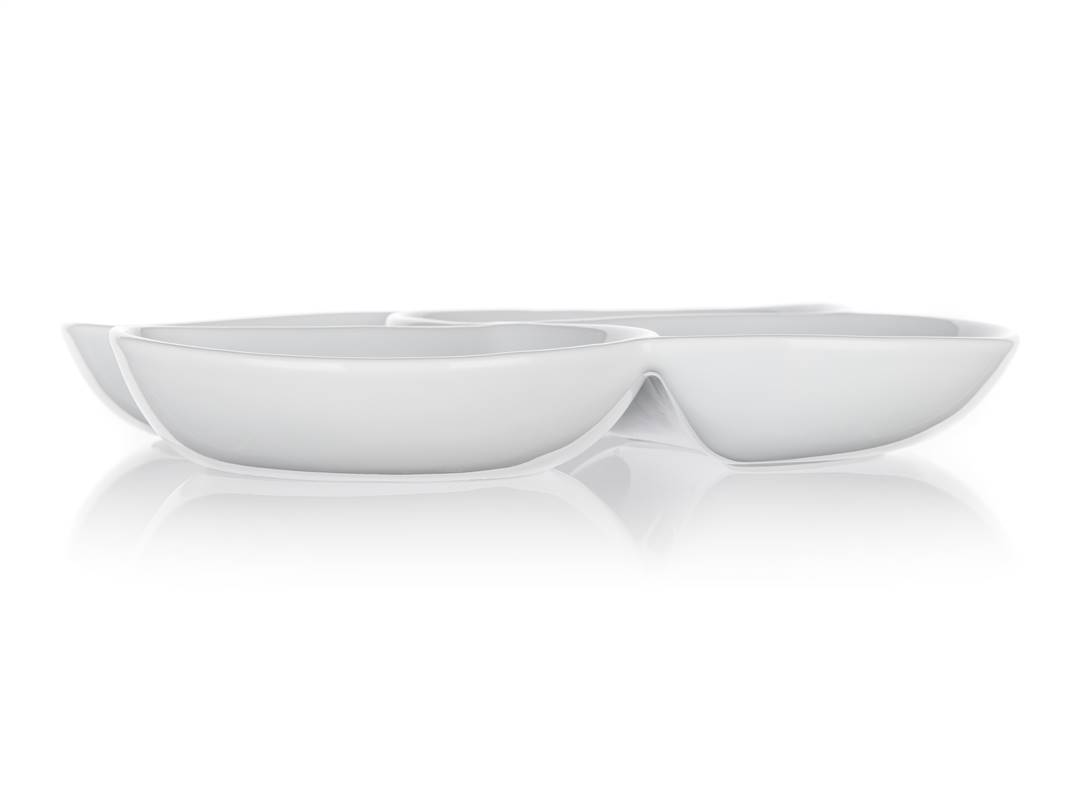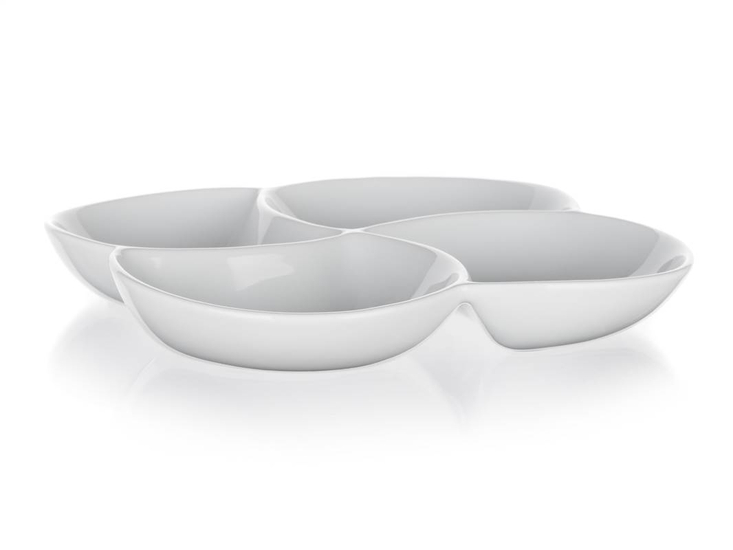 Porcelanowa miska do serwowania BIANCA w kolorze białym, w kształcie koniczyny o wymiarach 26,5 x 26,5 cm i wysokości 4,2 cm nadaje się do serwowania różnych dipów, orzechów, chipsów, owoców lub warzyw. Nadaje się do codziennego użytku. Misa jest odpowiednia do mycia w zmywarce do naczyń.