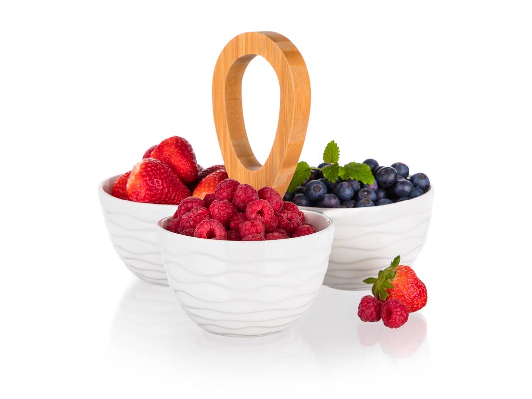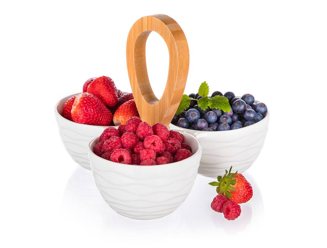 Okrągłe dzielone porcelanowe miseczki z bambusowym uchwytem o wymiarach całkowitych 24 x 24 x 18,5 cm. Miska jest idealna do serwowania różnego rodzaju orzeszków, suszonych owoców, oliwek itp.