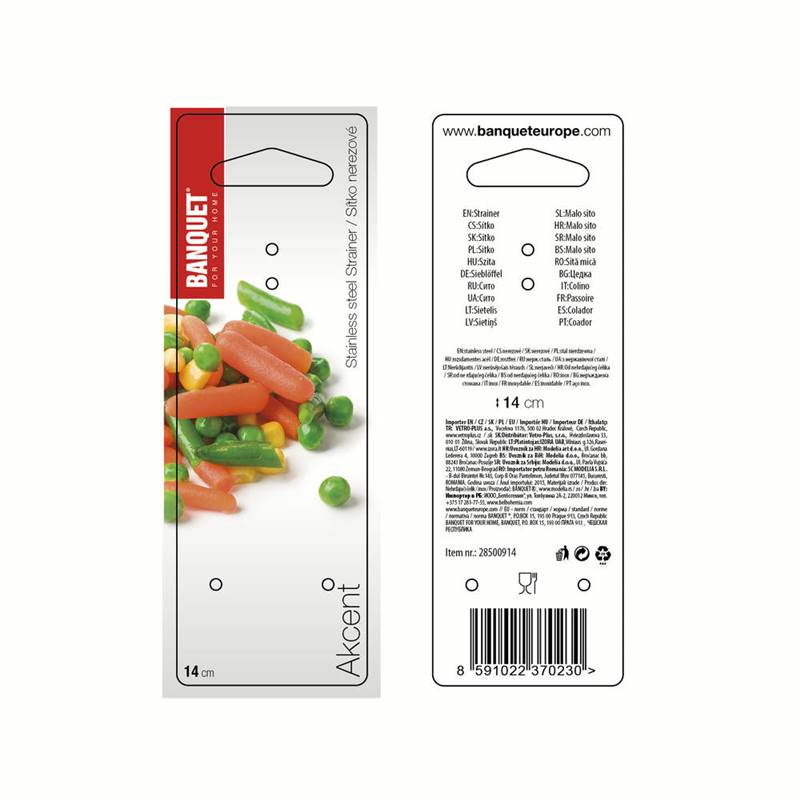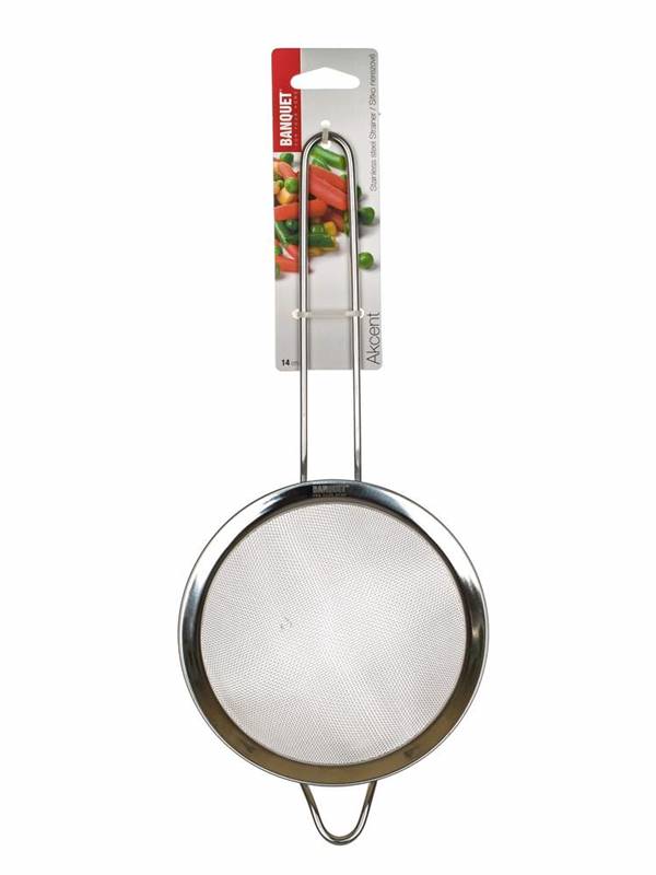 Sitko AKCENT o średnicy 14 cm, długość uchwytu 17 cm z uszkiem do zawieszenia. Materiał: stal nierdzewna 202, ilość 20 oczek na cm2. Sito jest przeznaczone do różnego rodzaju cieczy i napojów.