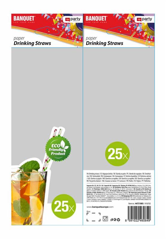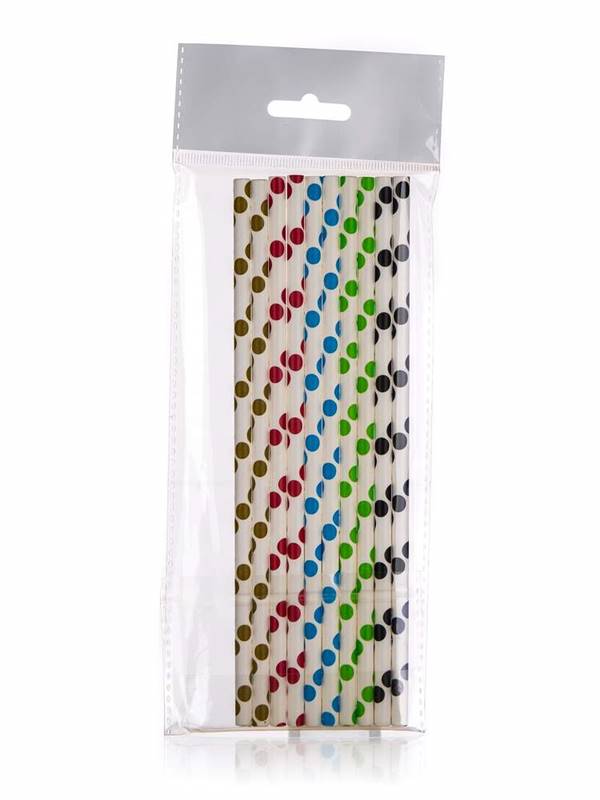 Słomki papierowe do napojów 25 szt., średnica 6 mm, długość 197 mm są wyprodukowane z papieru ulegającego biodegradacji. Papierowe słomki są idealne na imprezy urodzinowe, wieczorki i wesela. Słomki są dostarczane w miksie kolorów: kropki – czerwone, niebieskie, zielone, czarne.