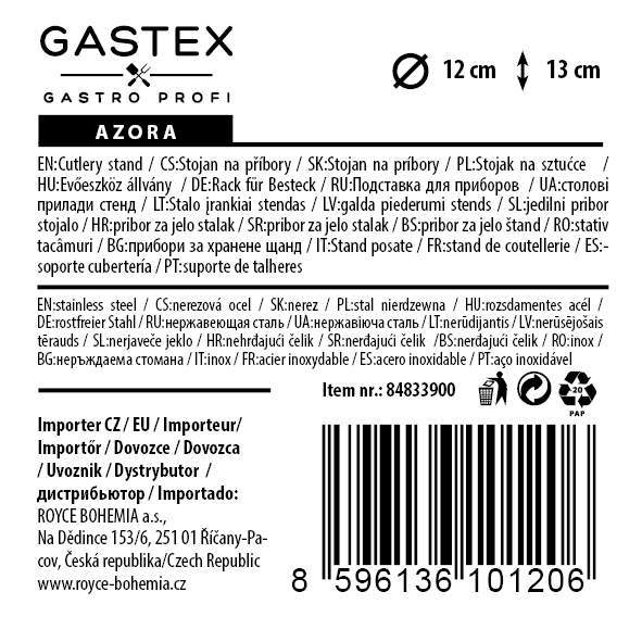 Stojak ze stali nierdzewnej na sztućce AZORA 12 cm, jest odpowiedni nie tylko jako stojak, ale także jako ociekacz na sztućce. Ma nowoczesny design i matową powłokę ze stali nierdzewnej. Stojak może zostać wykorzystany również podczas spożywania posiłków, wówczas sztućce będą nieustannie w zasięgu ręki.