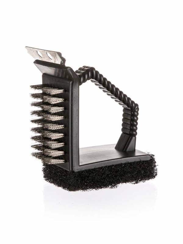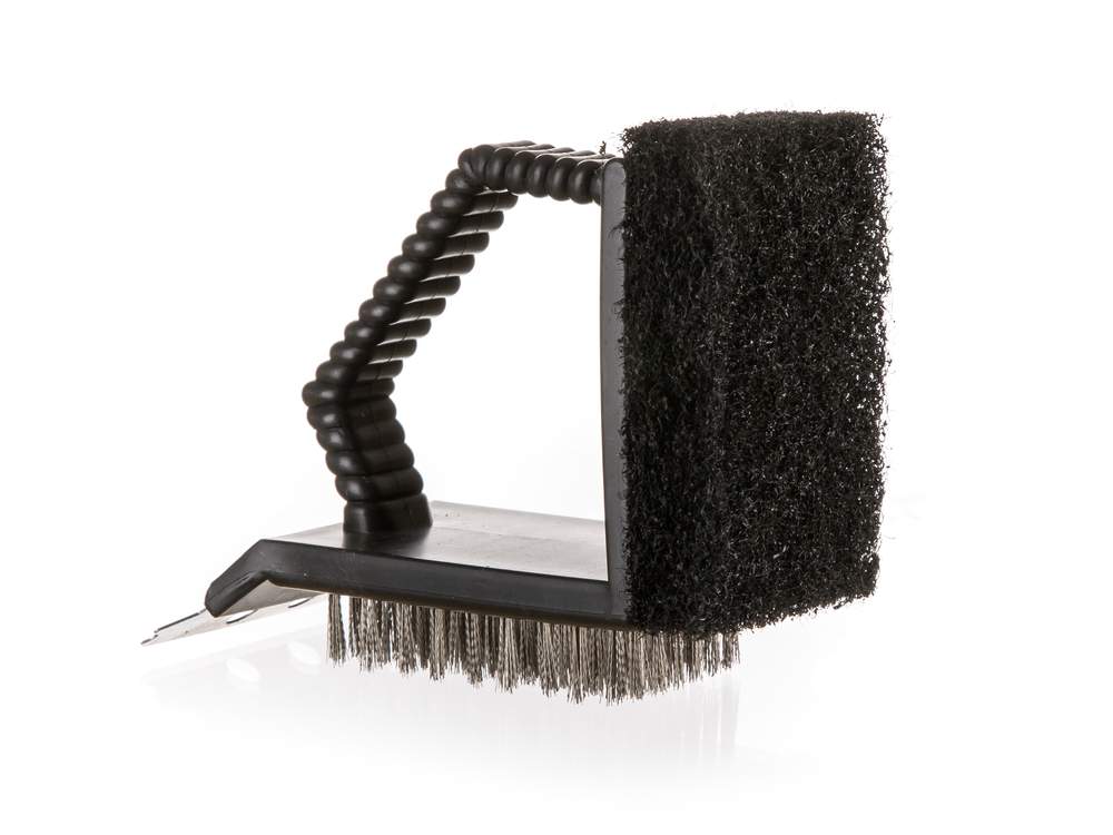 Plastikowa szczotka do czyszczenia 3 w 1 jest przeznaczona do utrzymania i czyszczenia grilla oraz kratki do grilla. Szczotka jest praktycznym pomocnikiem podczas sprzątania grilla po grillowaniu. Zawiera skrobak do usunięcia grubego zanieczyszczenia płyty do grillowania, szczotkę metalową do oczyszczenia grubego zanieczyszczenia z kraty do grillowania oraz ściereczkę gąbczastą do doczyszczenia powierzchni utrzymania.