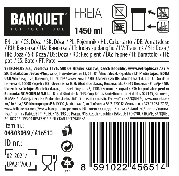 Materiał: Szkło / plastik / metal | Kolor: Przeźroczysty | Zmywarka: Pojemnik tak / pokrywa nie | Mikrofalówka: Nie – EAN: 8591022456514