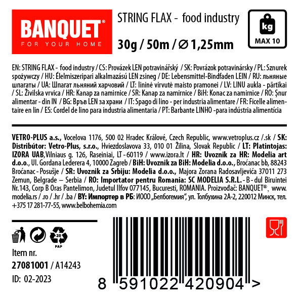 Sznurek do żywności LEN 30 g / 50 m, średnica 1,25 mm, średnica kłębka 6 cm, nośność 10 kg, biały.