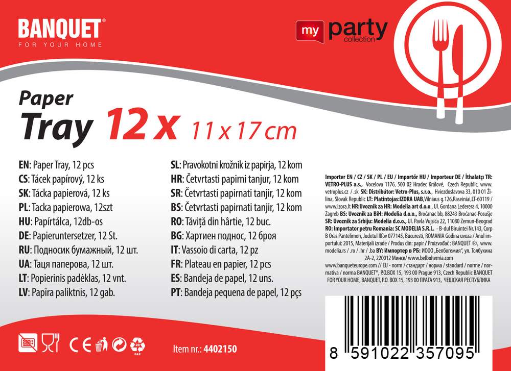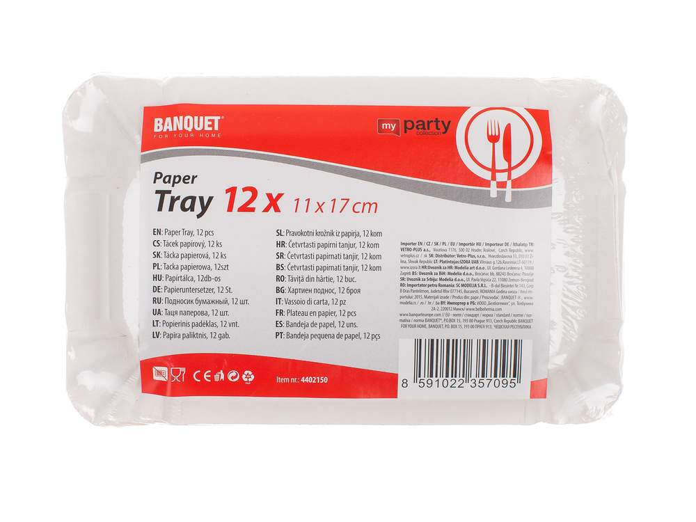 Taca papierowa o wymiarach 11 x 17 cm, 12 szt. w zestawie. Produkt można wykorzystać na imprezę plenerową, piknik itp.