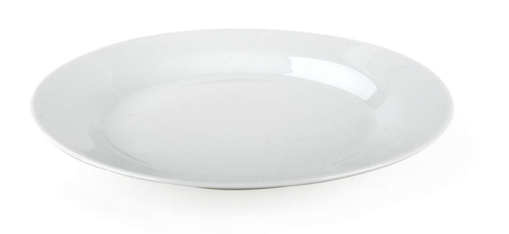 Talerz płaski bez wzoru 24 cm, materiał – porcelana, talerz jest odpowiedni do jednostek gastronomicznych, może być stosowany w mikrofalówce i myty w zmywarce do naczyń.