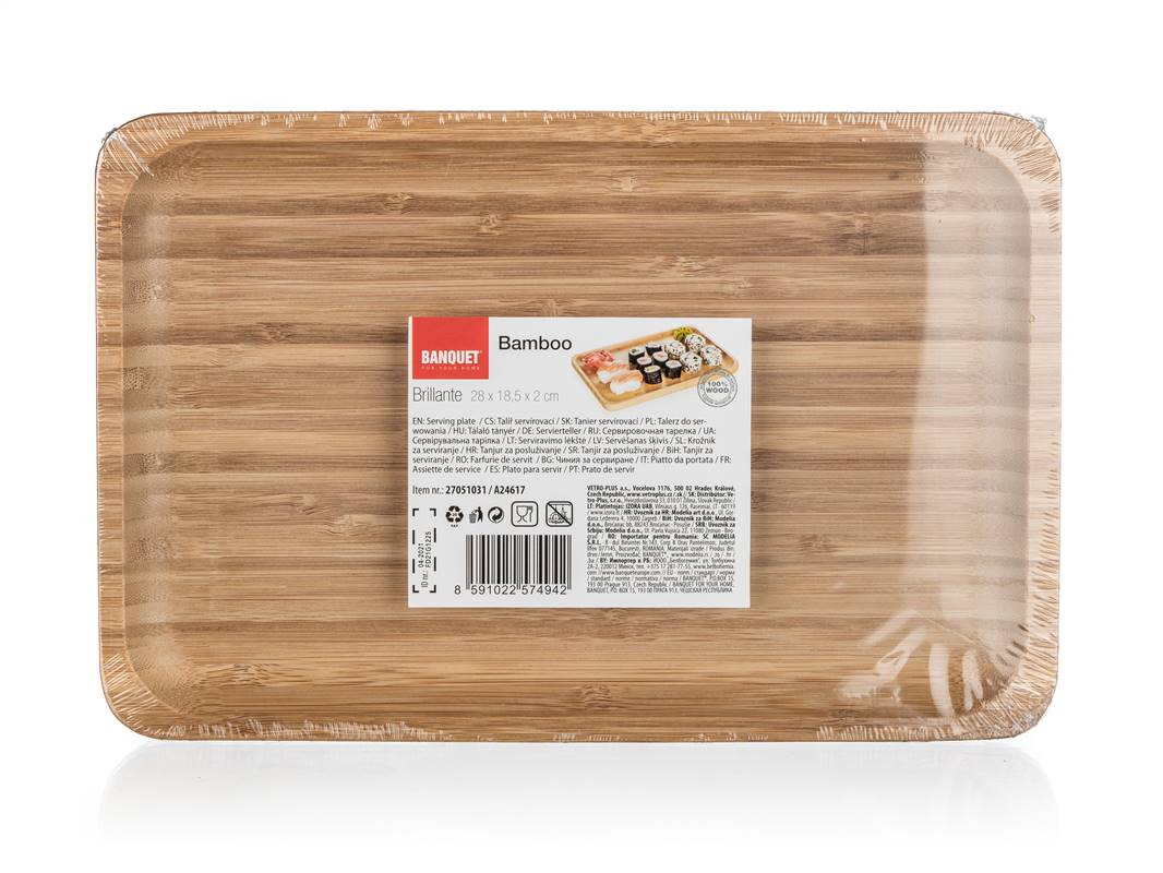 Talerz do serwowania 28 x 18,5 x 2 cm z jakościowego naturalnego drewna bambusowego, umożliwia serwowanie smakołyków, które lubisz najbardziej. Jest ograniczony wyższym obrzeżem, wszystko więc pozostanie tam, gdzie powinno. Talerz można uzupełnić o dalsze produkty z serii BRILLANTE BAMBOO.