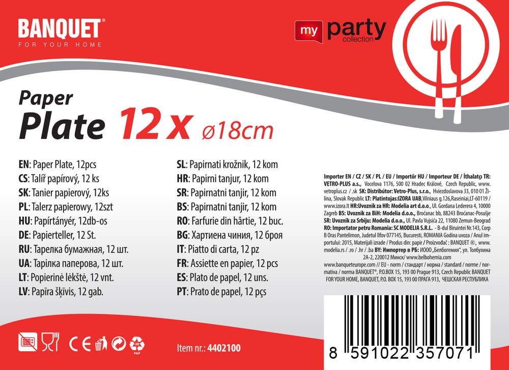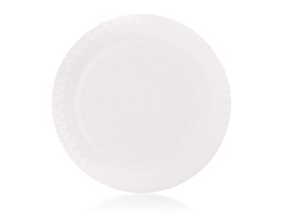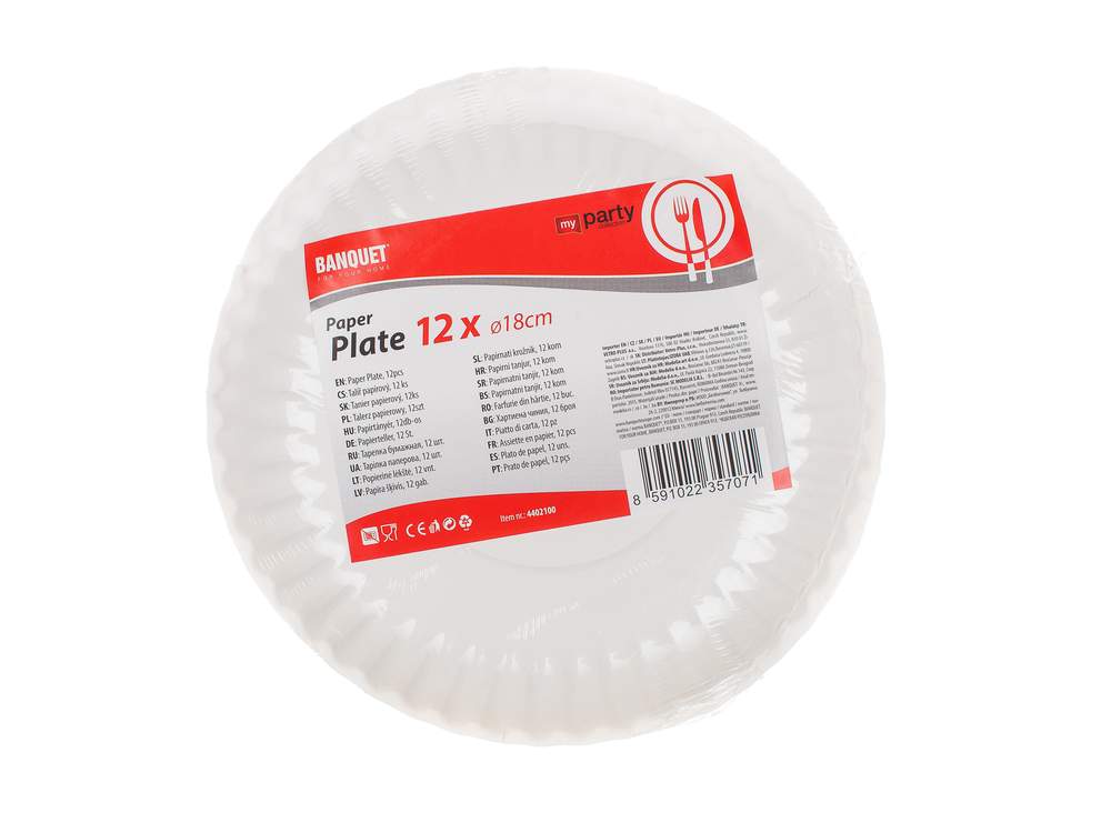 Talerz papierowy o średnicy 18 cm, 12 szt. w zestawie. Produkt można wykorzystać na imprezę plenerową, piknik itp.
