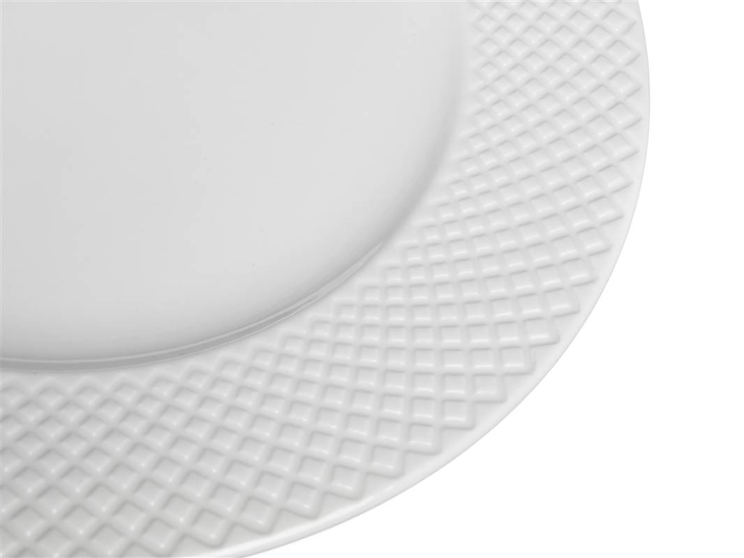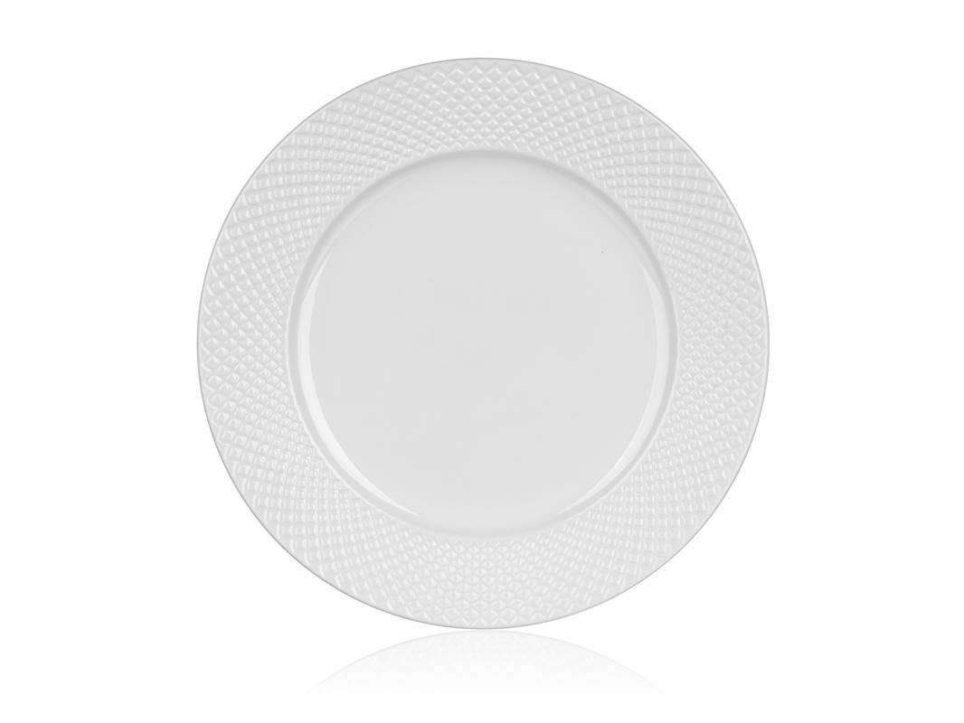 Talerz płytki DIAMOND 27 cm w kolorze białym z dekoracyjnym reliefem, wyprodukowany z ceramiki. Może być stosowany w mikrofalówce i myty w zmywarce do naczyń, do normalnego wykorzystania w gospodarstwach domowych.