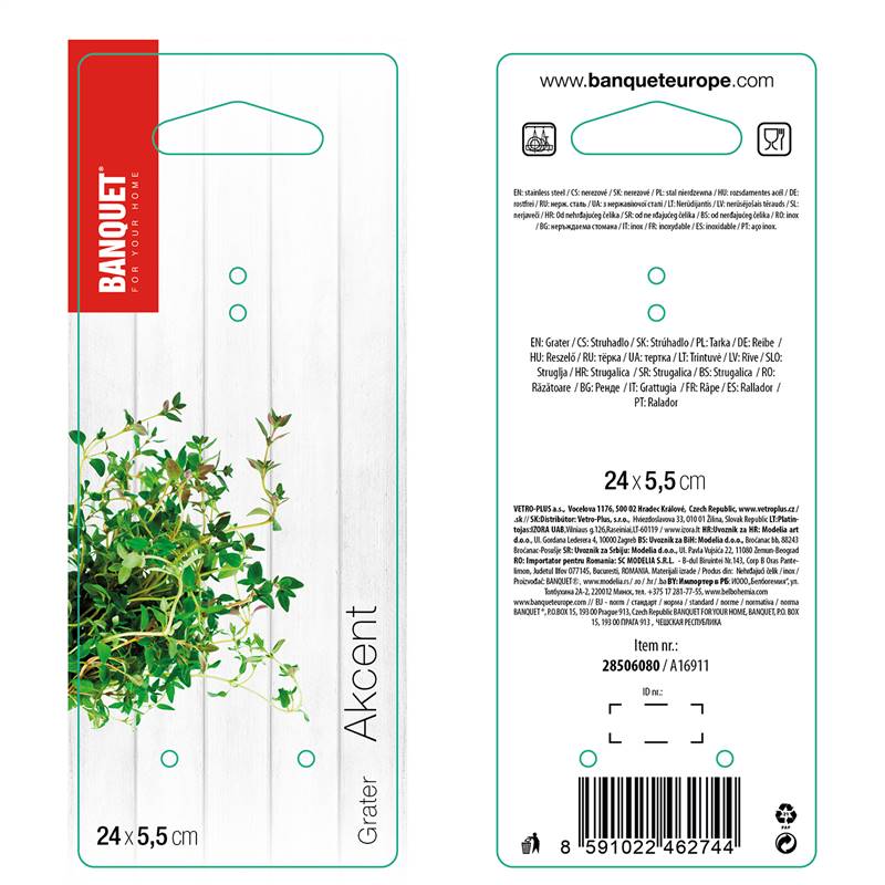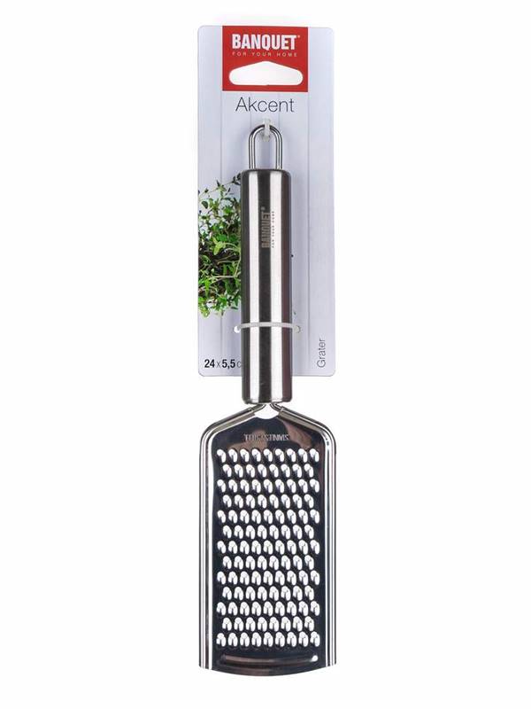 Tarka AKCENT 24 x 5,5 cm wyprodukowana ze stali nierdzewnej, przeznaczona do wykorzystania profesjonalnego i w gospodarstwach domowych. Tarka jest wyposażona w praktyczne oczko umożliwiające zawieszenie, łatwo się utrzymuje, można myć w zmywarce do naczyń. Seria naczyń kuchennych AKCENT spełnia trudne wymagania profesjonalistów i jest przeznaczona także do wykorzystania w gospodarstwach domowych. Prosty i funkcjonalny design zapewnia ponadczasową oraz długą moralną i jakościową żywotność wszystkich produktów.