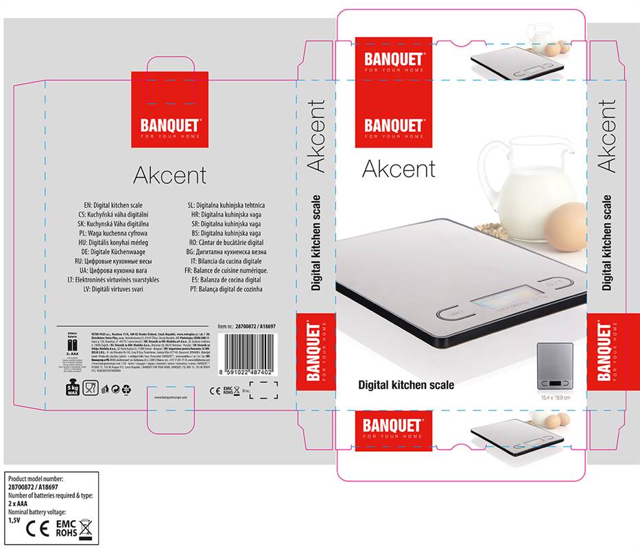 Cyfrowa waga kuchenna AKCENT 5 kg, ekran LCD ze sterowaniem dotykowym z możliwością ważenia w g, oz, lb. Obciążenie maksymalne 5 kg, rozdzielczość 1 g, indykator słabej baterii i przeładowania, automatyczne wyłączenie, zasilanie baterią 2 x baterie AAA (nie są częścią pakietu).